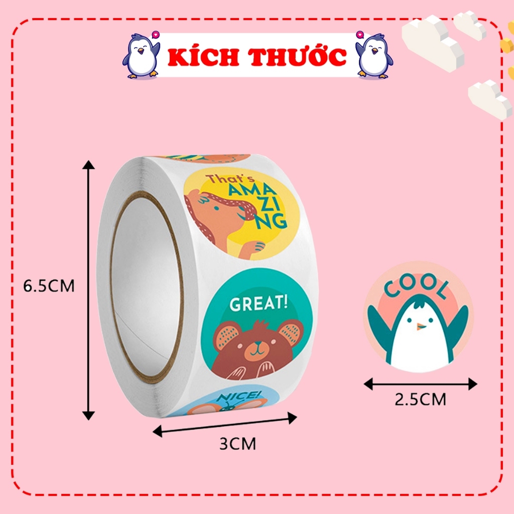 Cuộn 500 sticker nhãn dán khích lệ khen thưởng học tập cho bé nhiều hoạ tiết đáng yêu