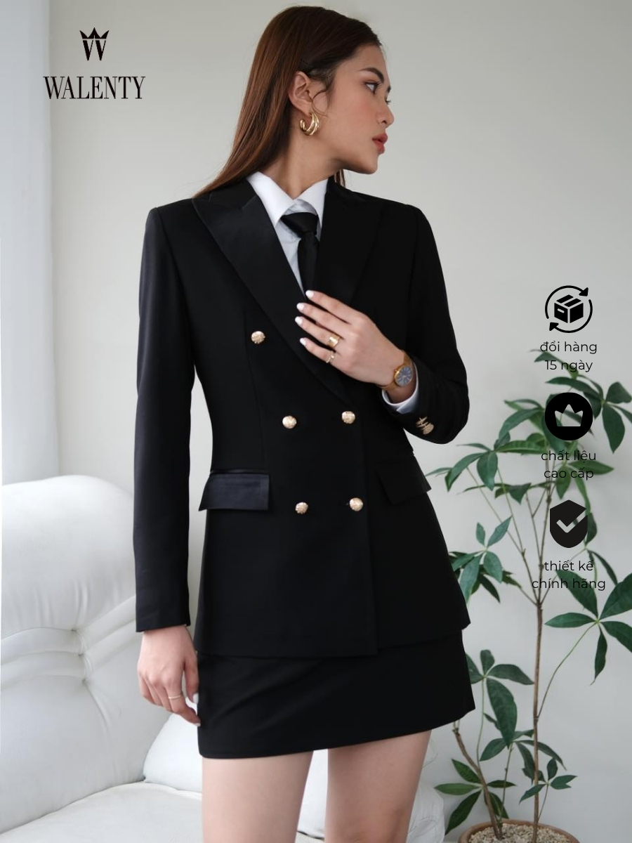 [Walenty] Áo Blazer nữ Double Breast 6 khuy phối ve cổ lụa sang trọng, cổ điển màu trắng/ đen