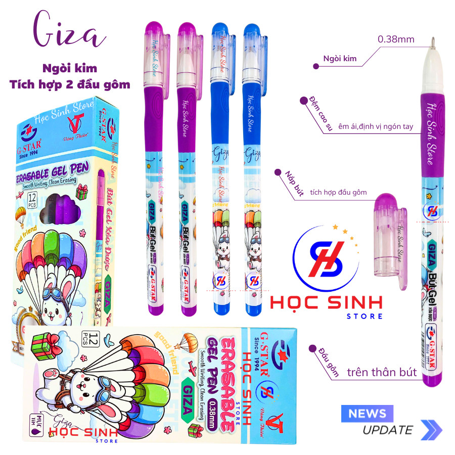 Hộp 12 Cây Bút Xóa Được Giza G-Star Ngòi Kim 0.38mm Mực Xanh/Tím - Dành Cho Học Sinh Tiểu Học, Màu Mực Chuẩn