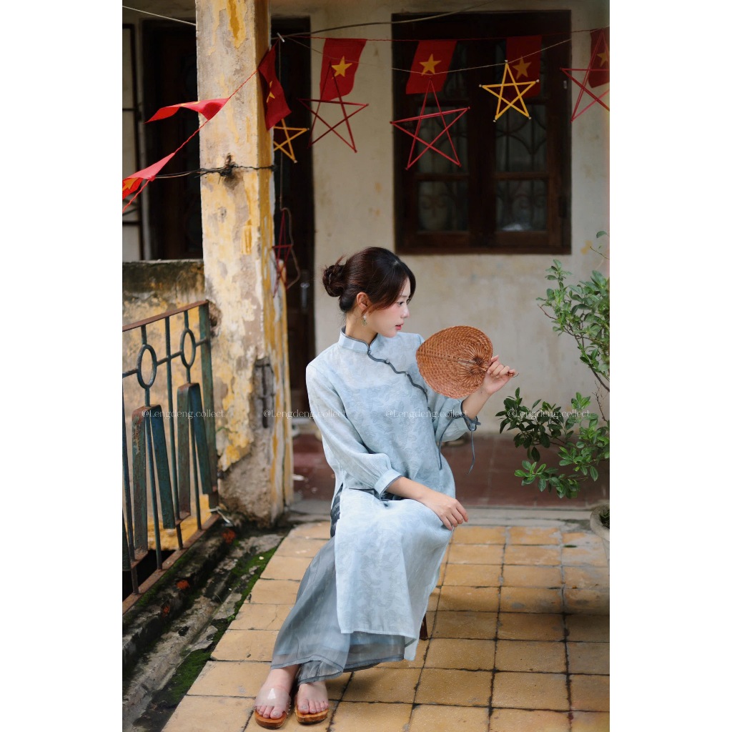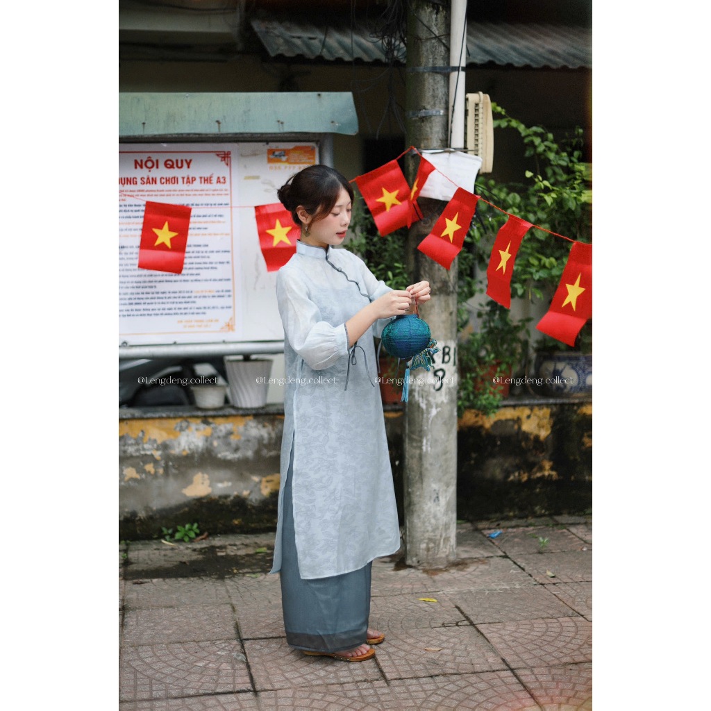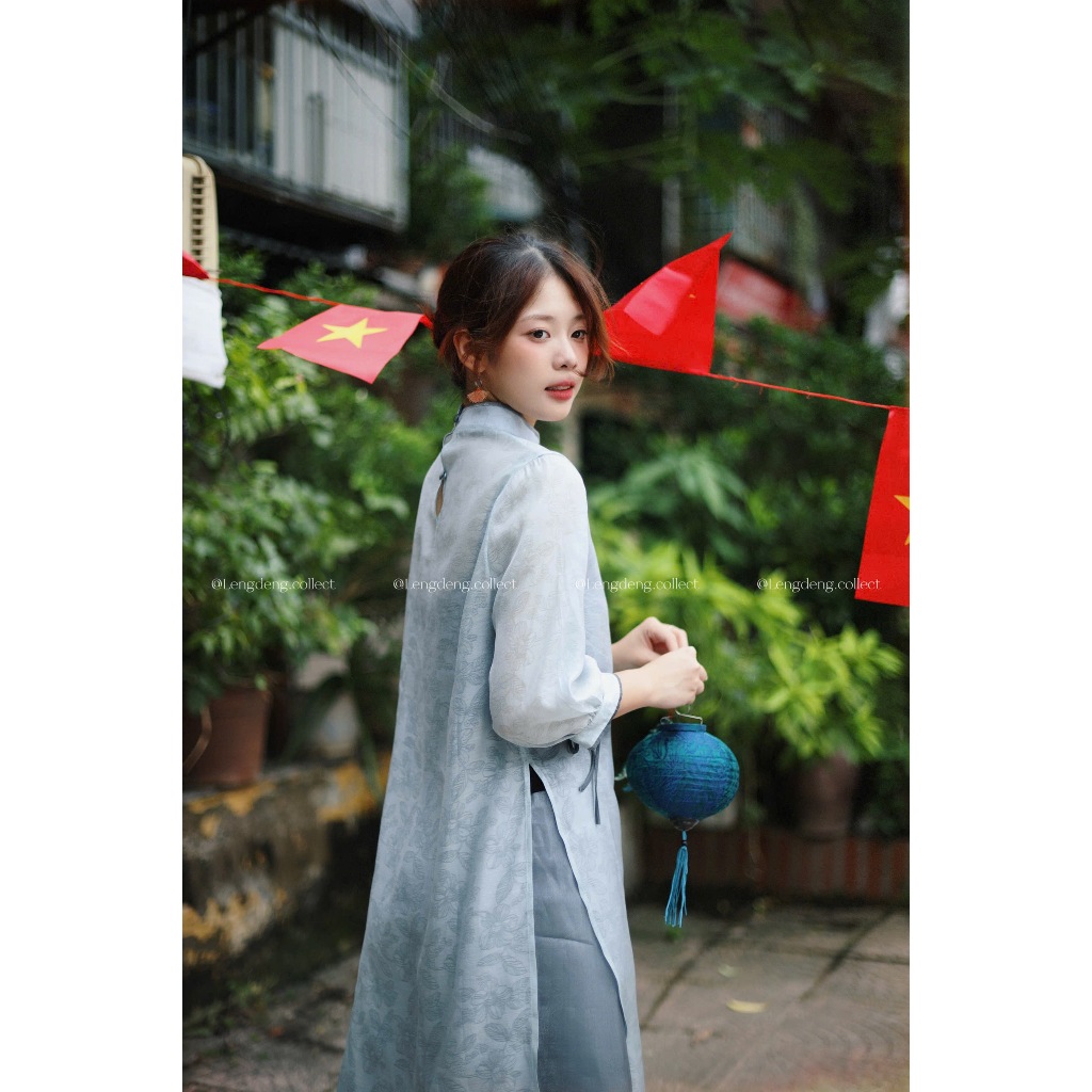 Áo Dài Lê Trắng - Lengdeng.Collect | Áo dài dáng suông cách tân vải tơ phối hoa xanh trời Lèng Dèng