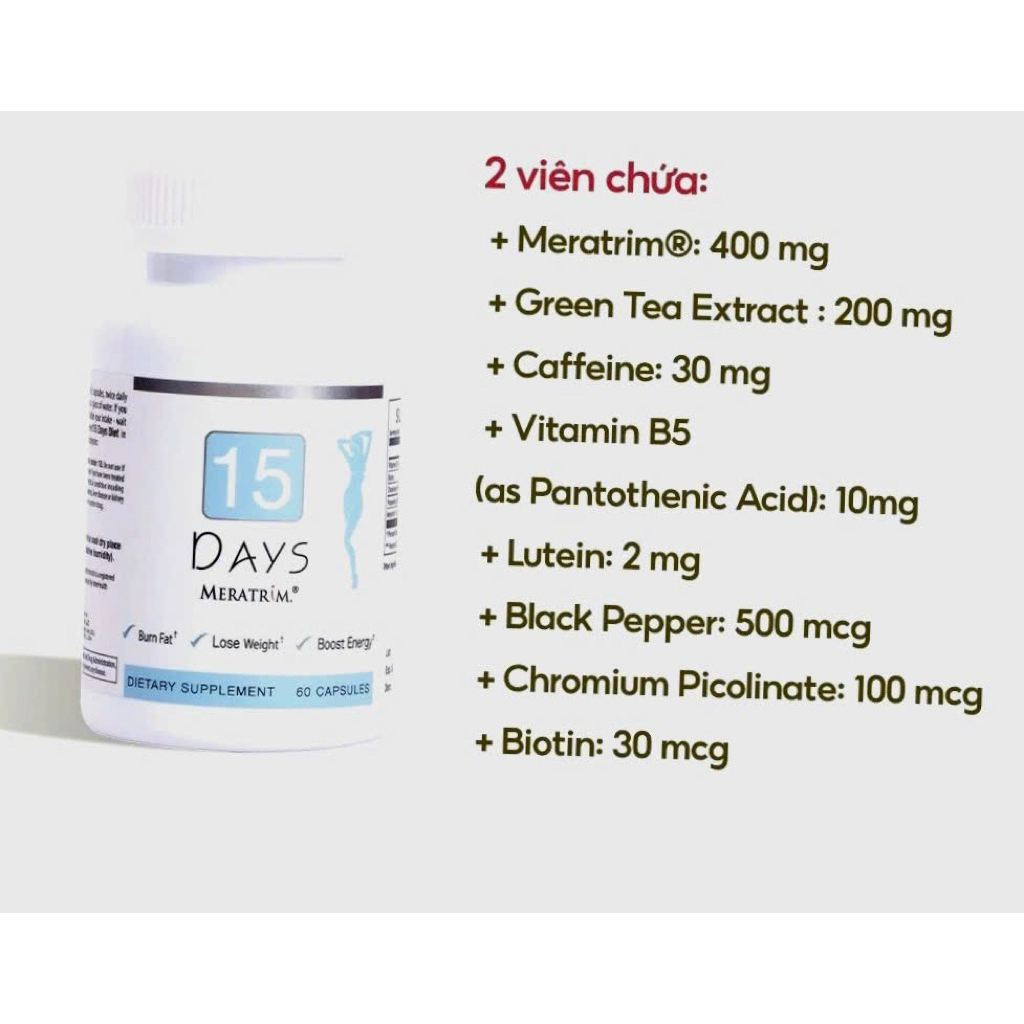 Giảm cân 15 DAYS MERATRIM 60 (MỸ) Viên uống giảm béo an toàn, nhanh chóng. Lọ 60 viên