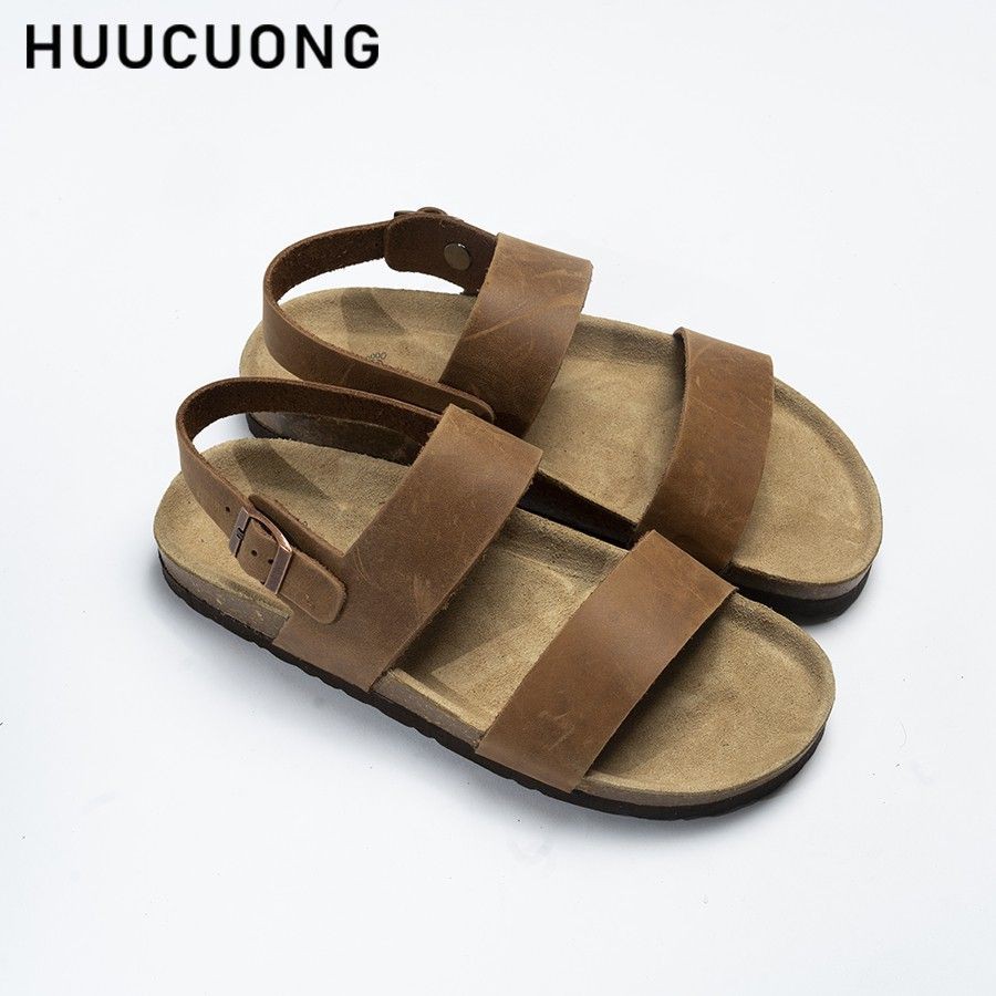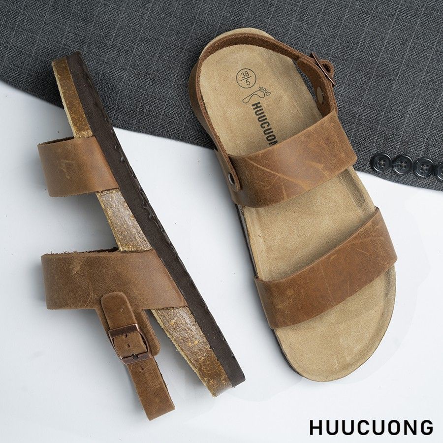 [Miễn Phí Ship] Sandal HuuCuong 2 quai da bò nâu đế trấu
