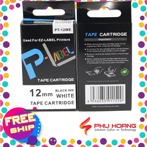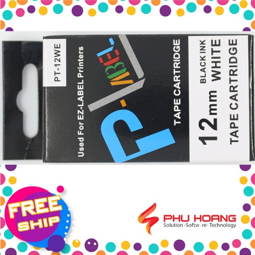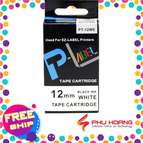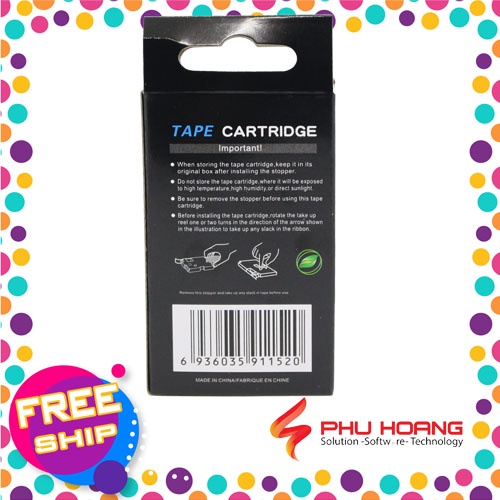 Nhãn in Casio PT-12WE, chữ đen nền trắng, khổ rộng 12mm