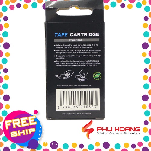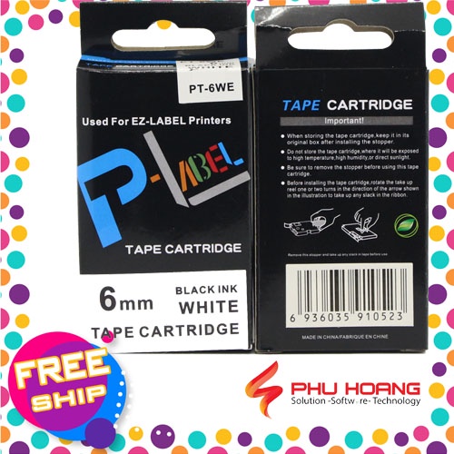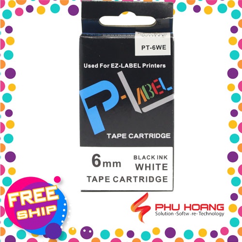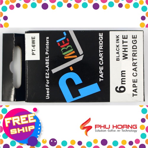 Nhãn in casio PT-6WE, chữ đen nền trắng, khổ rộng 6mm
