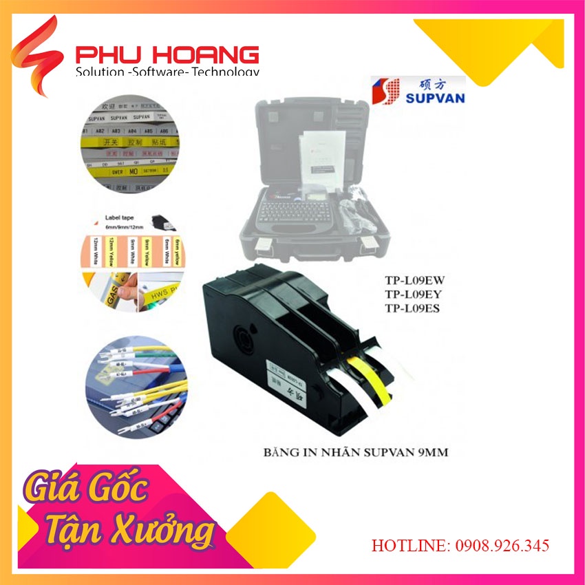 Băng in nhãn Supvan TP-L09EY, kích thước rộng 9mm dài 16m, màu vàng, sử dụng cho máy in nhãn Supvan TP-70E, TP-76E.