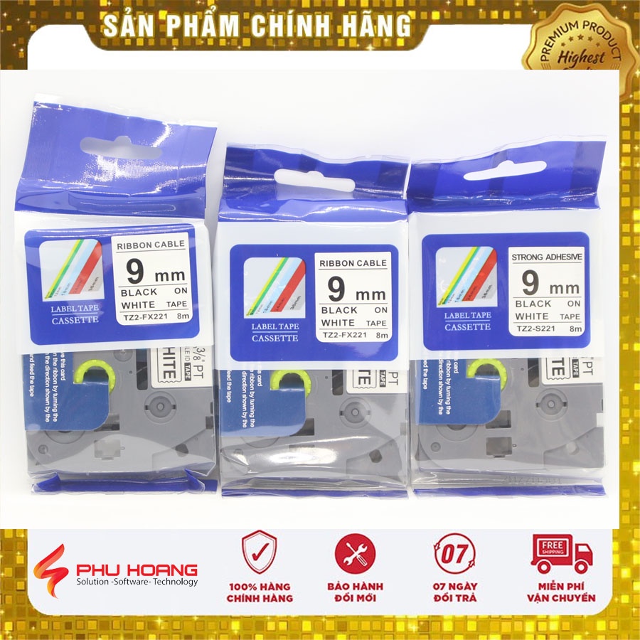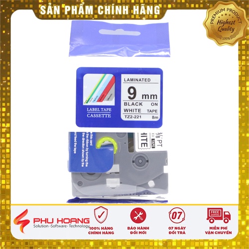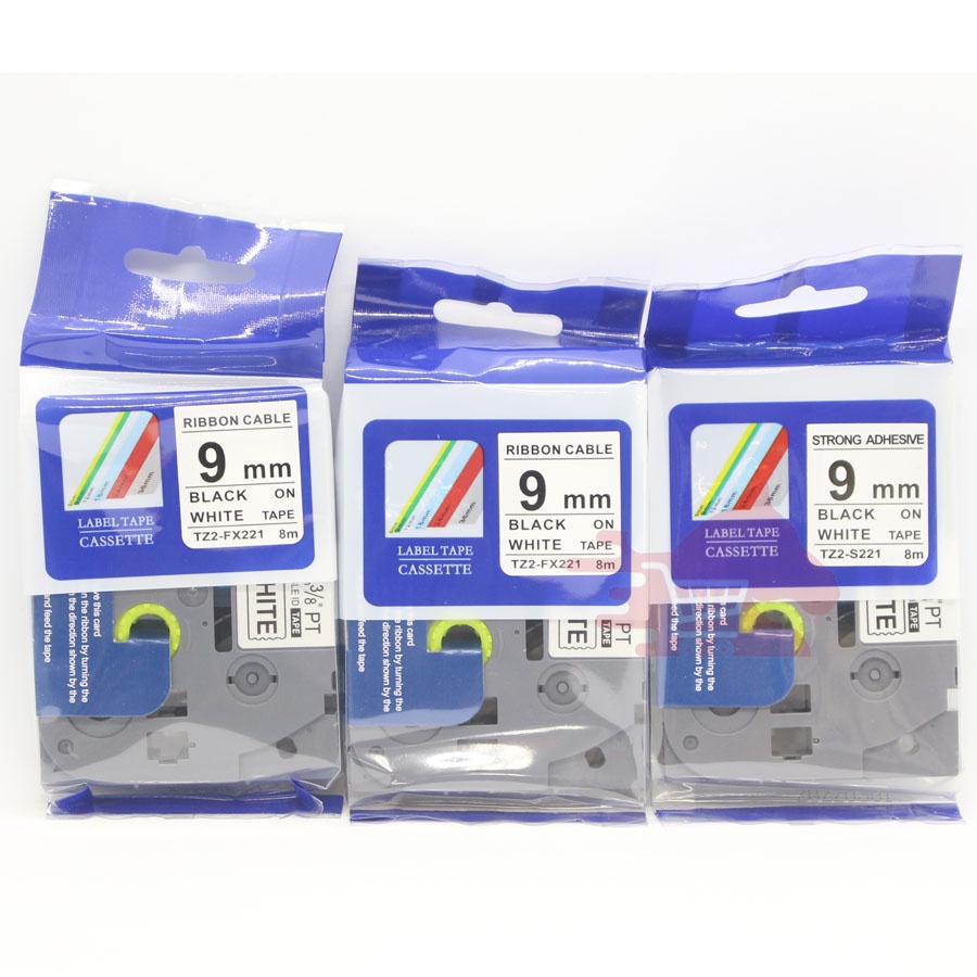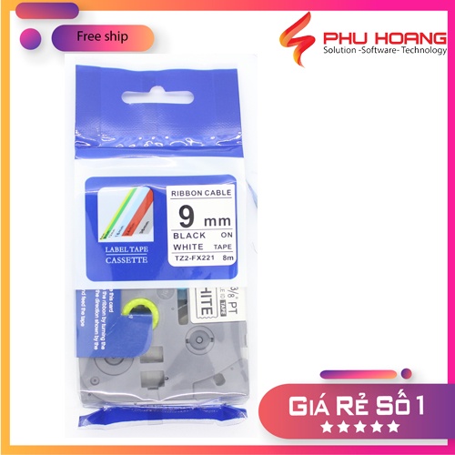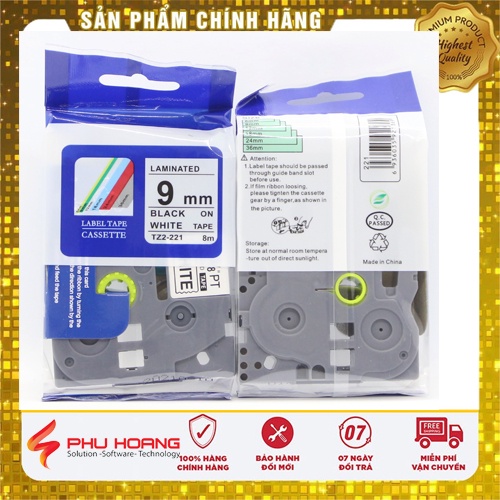 [Combo 3 hộp+ freeship] Nhãn in Tz2-221, khổ rộng 9mm* dài 8m, chữ đen nền trắng, sử dụng cho máy in nhãn Brother Ptouch
