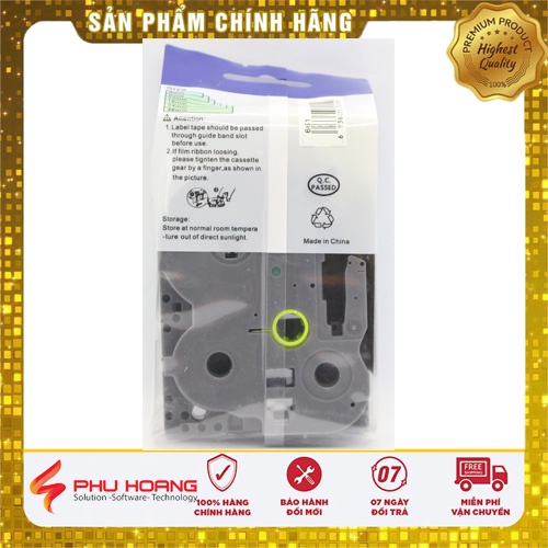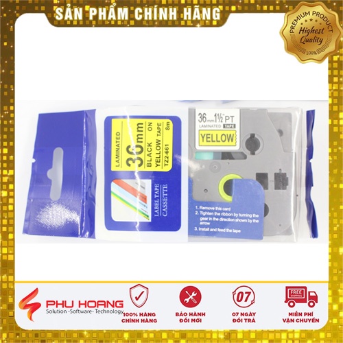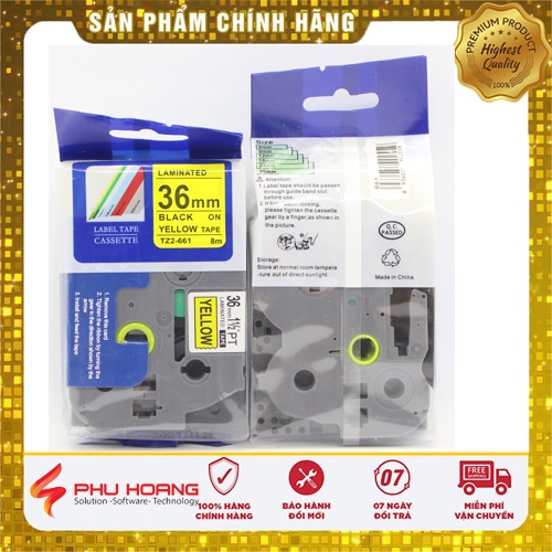 Nhãn in TZ2-661, Khổ rộng 36mm, chữ đen nền vàng (Black on Yellow), nhãn in đa lớp, bám dính cao.