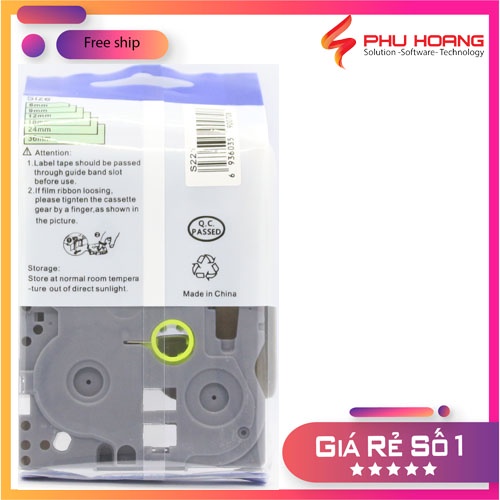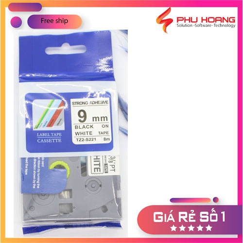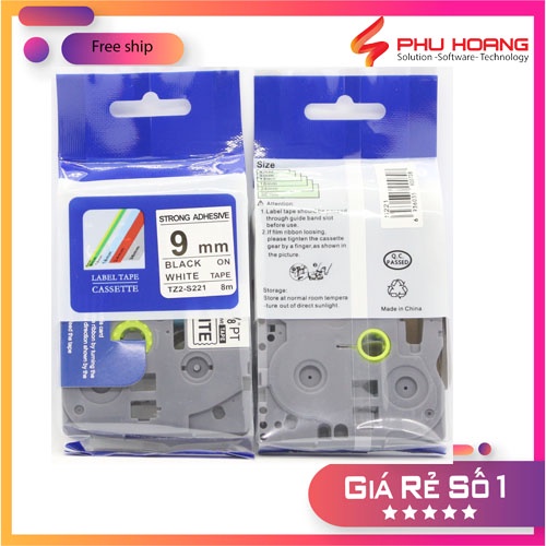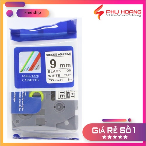 Nhãn in TZ2-S221, Khổ rộng 9mm, chữ đen nền trắng( Black on White), siêu dính, bám dính cao, chống thấm nước.