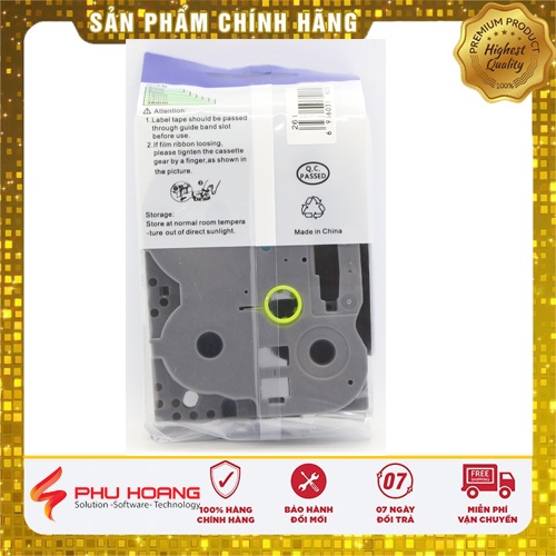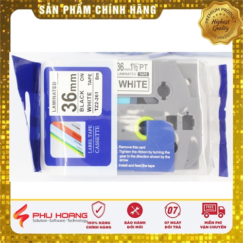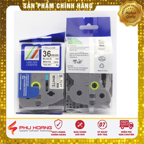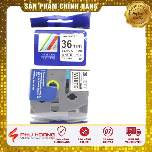Nhãn in TZ2-261, Khổ rộng 36mm, chữ đen nền trắng ( Black on white), nhãn đa lớp, bám dính cao
