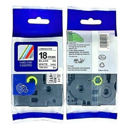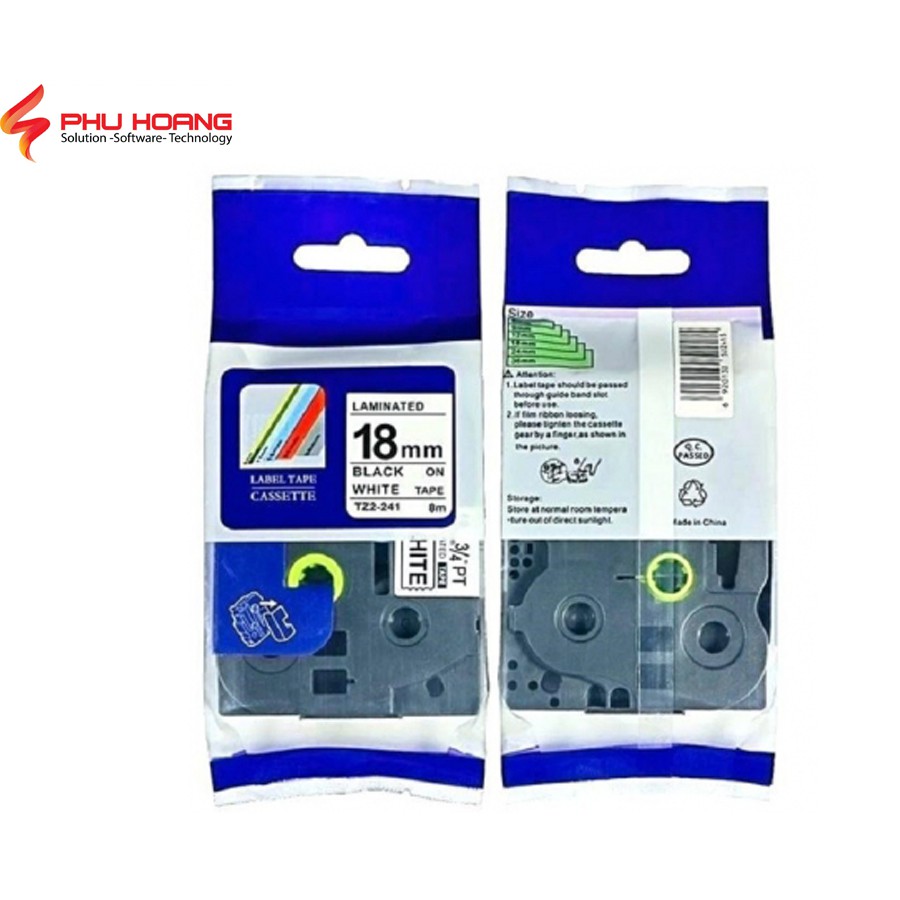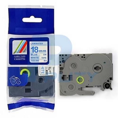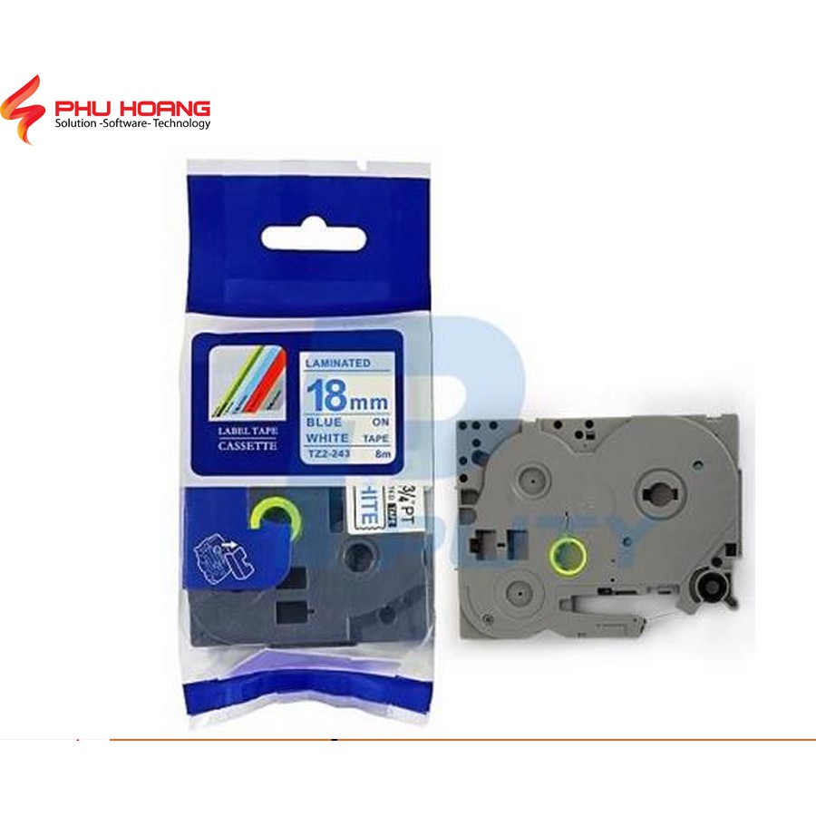 Nhãn in TZ2-243, Khổ rộng 18mm, chữ xanh nền trắng (Blue on White) , bám dính cao, chống trầy xước