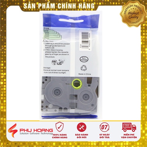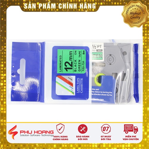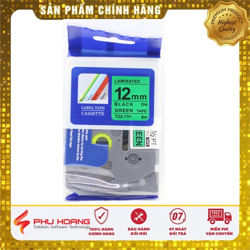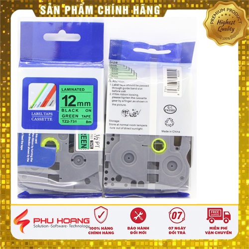 Nhãn in TZ2-731, Khổ rộng 12mm, chữ đen nền xanh lá (Black on green), nhãn in đa lớp, bám dính cao, chống trầy xước.