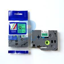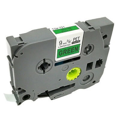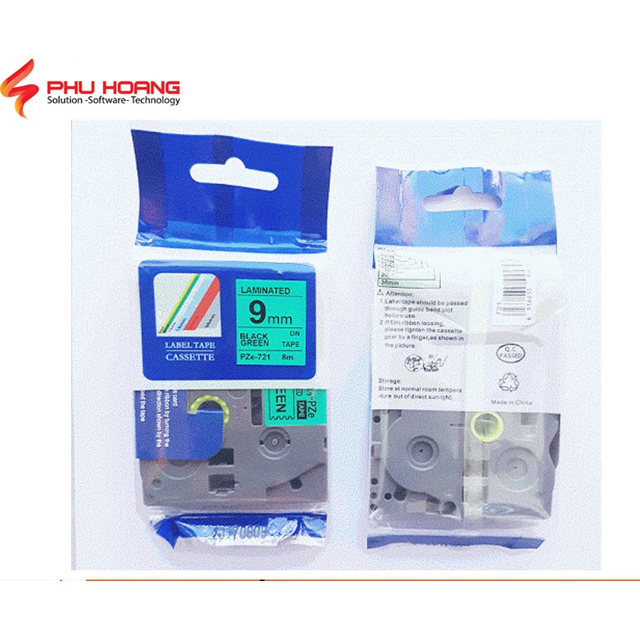 Nhãn in TZ2-721, Khổ rộng 9mm, chữ đen nền xanh lá (Black on green), nhãn in đa lớp, bám dính cao, chống trầy xước.