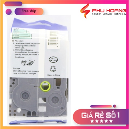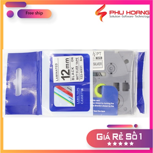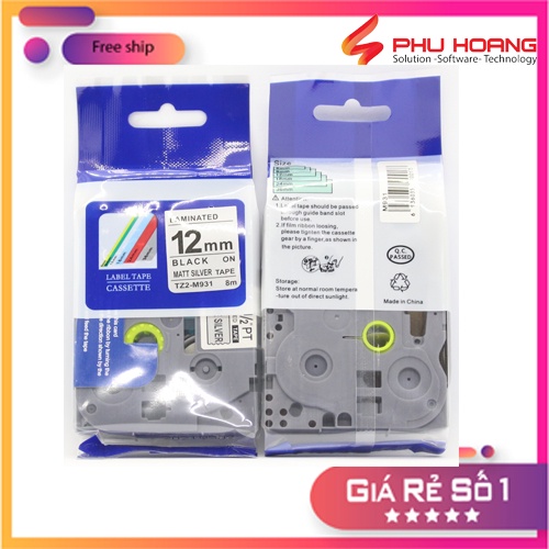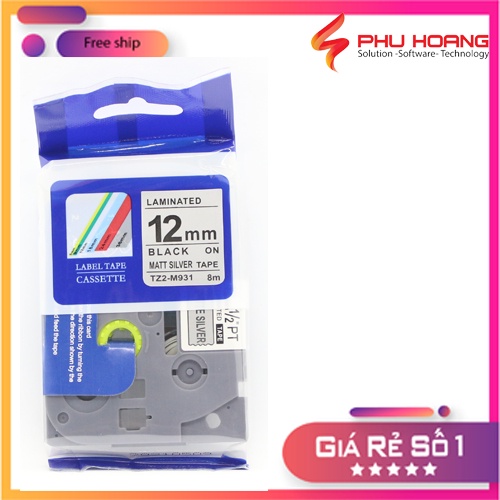Nhãn in TZ2-M931, Khổ rộng 12mm, chữ đen nền bạc( Black on Silver Matt), màu bạc, bám dính cao.