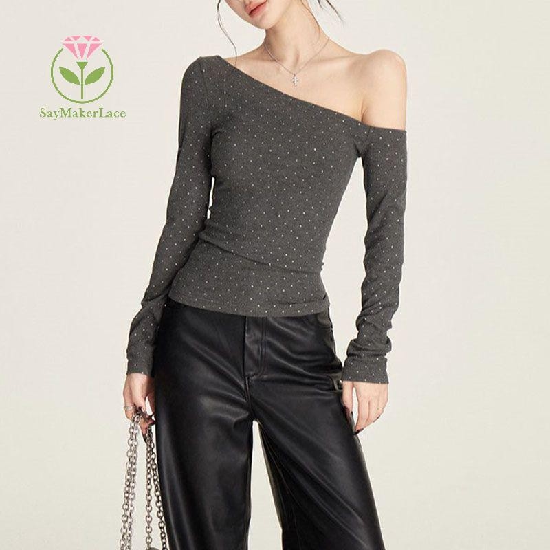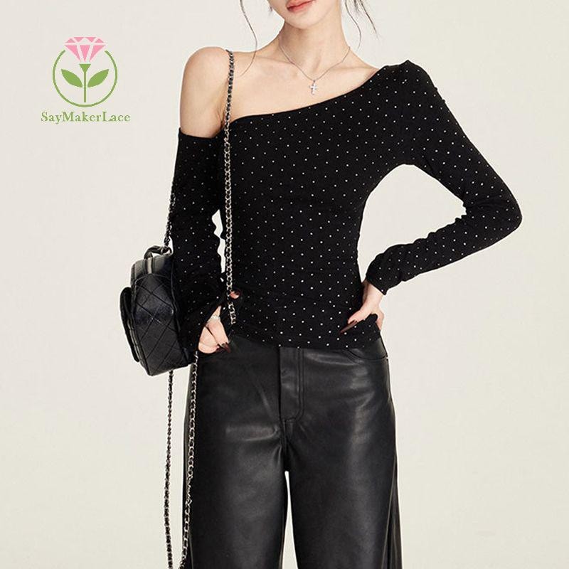 SayMaker Lace - Áo Thun Crop Top Nam Phong Cách Rời Vai Với Chi Tiết Kim Cương Giả