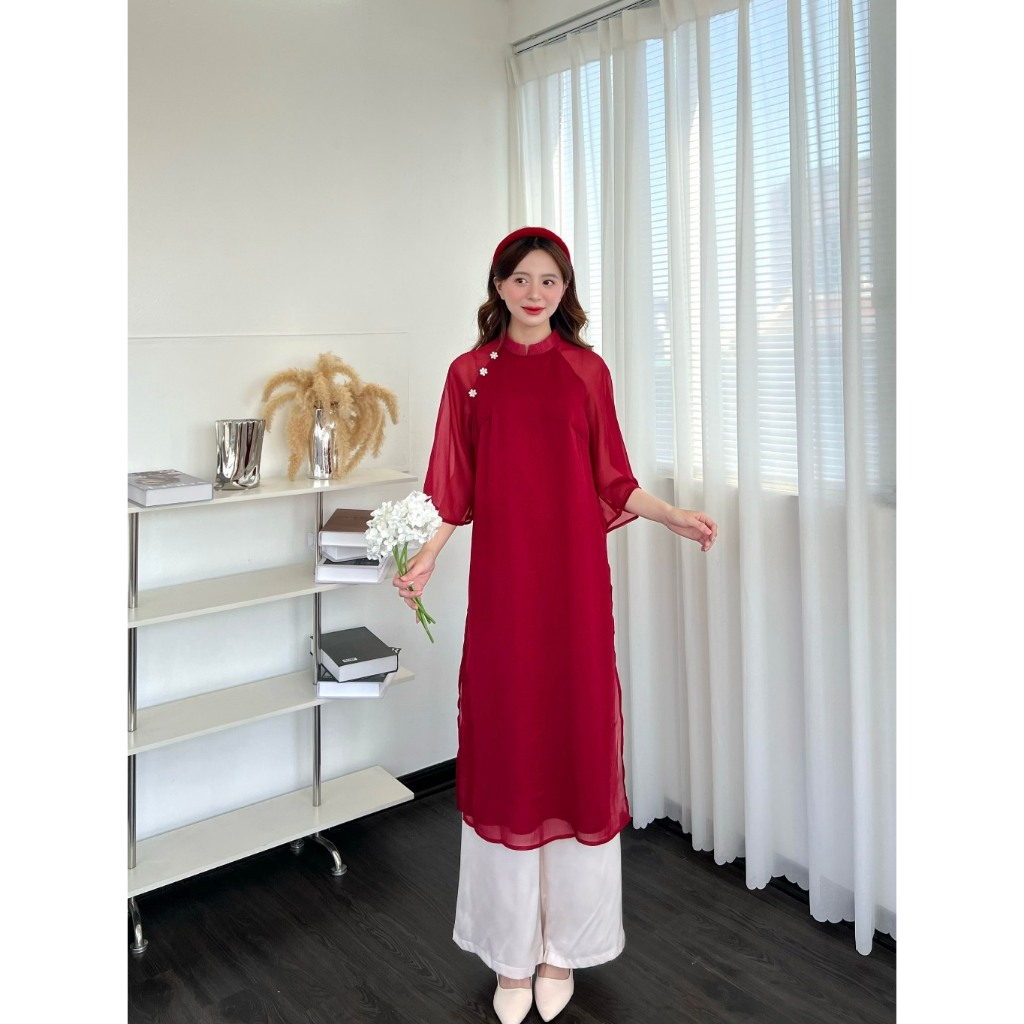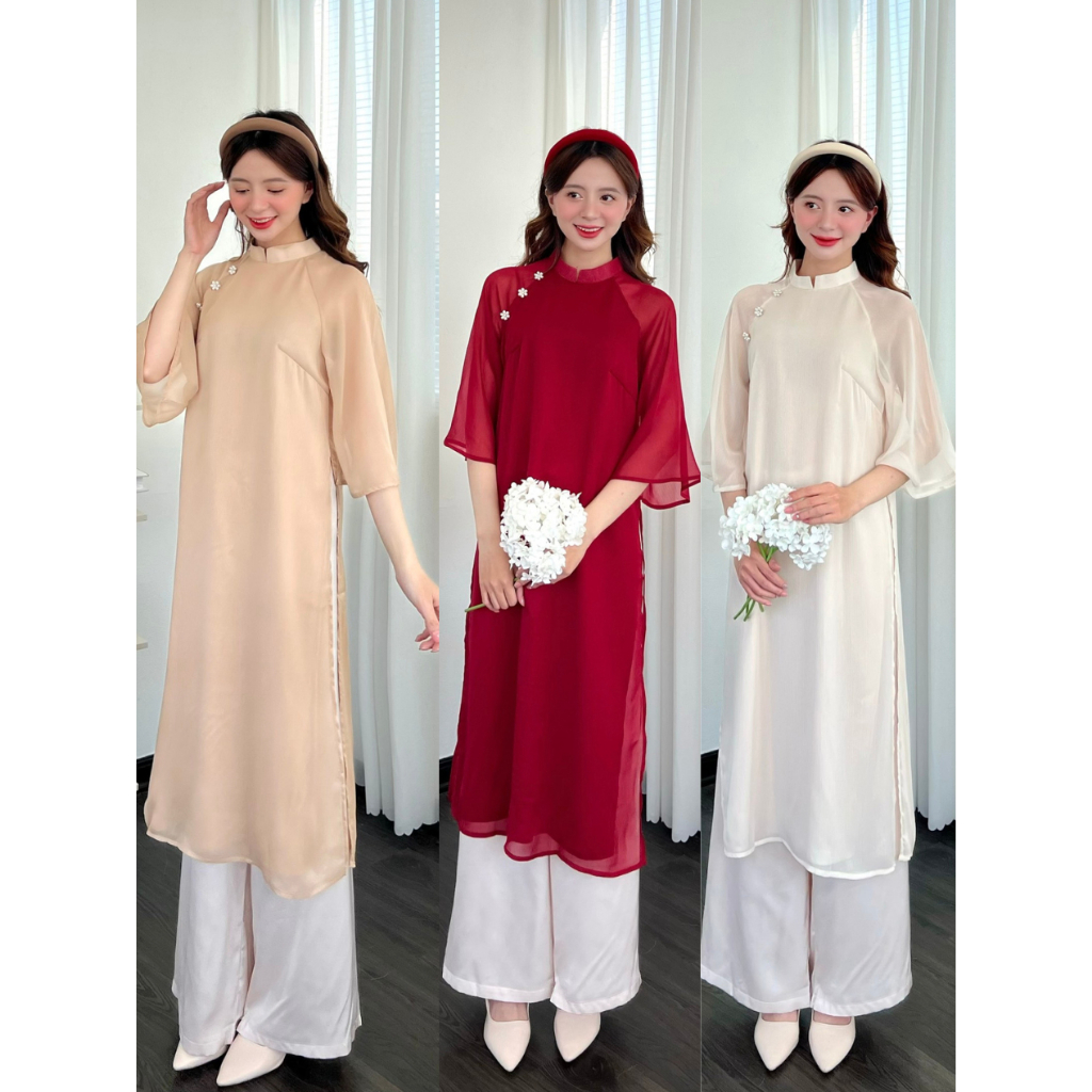 🦋Tặng Bờm Ngọc🦋 Áo Dài Cách Tân,Mẫu Hot Trend 4 Tà Đính Cúc Ngọc Phối Tay Loe Dễ Mặc Cho Các Nàng