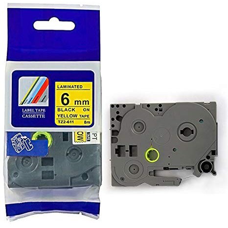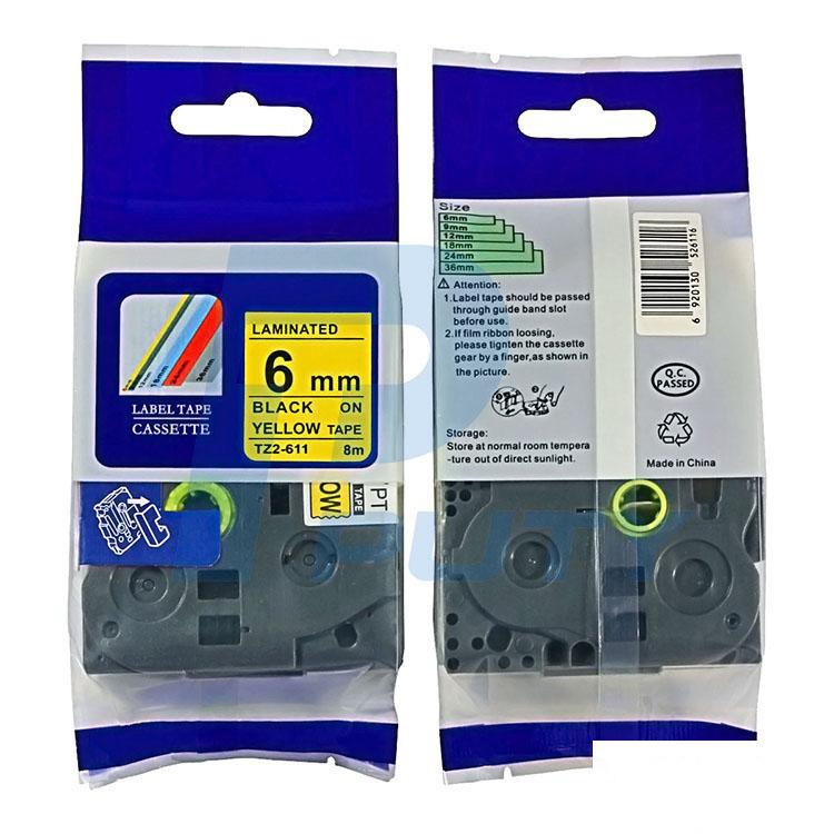Nhãn in TZ2-611, Khổ rộng 6mm, chữ đen nền vàng (Black on Yellow), nhãn in đa lớp, bám dính cao