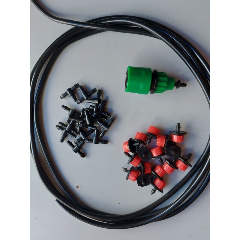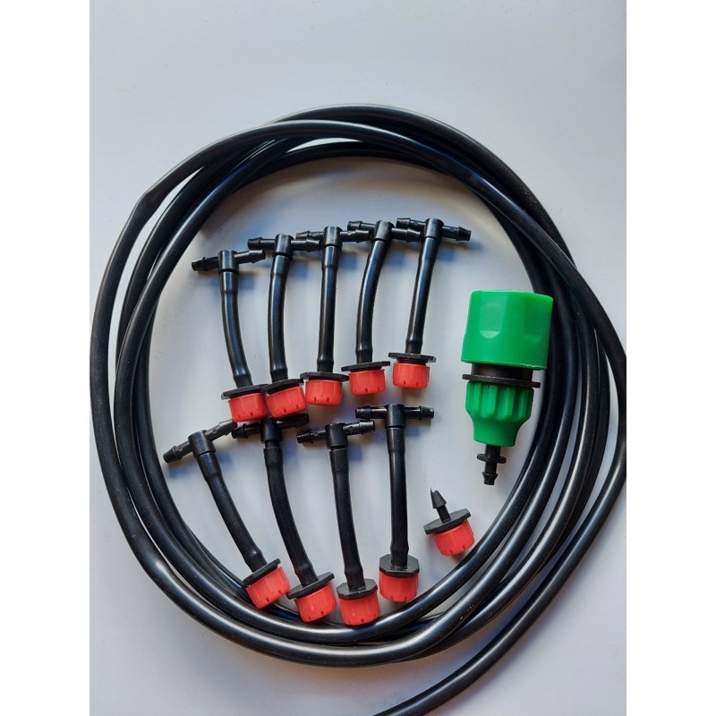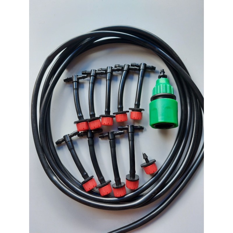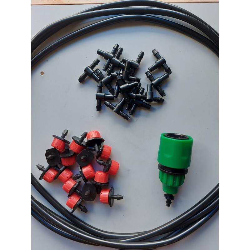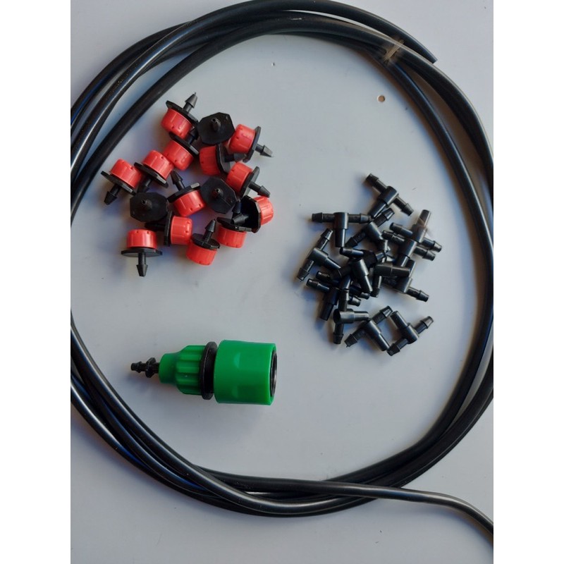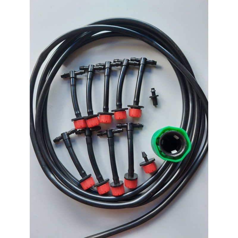 COMBO Bộ tưới đầu béc nhỏ giọt 8tia nguyên bộ 10m ống và 20m ống mềm 6li và 10 đầu béc và 10 T nối chia hướng.