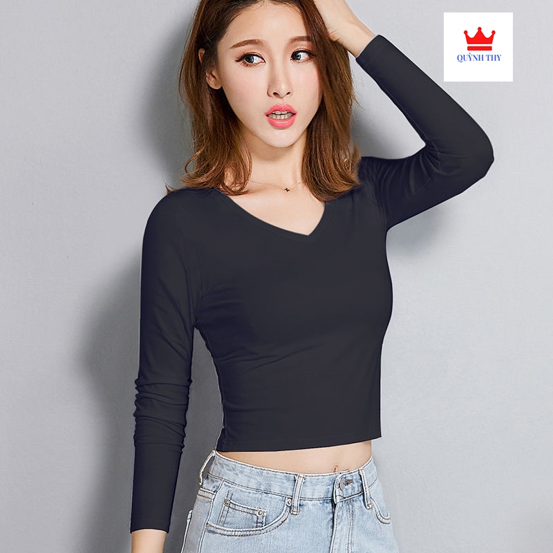 [ Hàng Hot ] Áo Thun Croptop Cổ Tim Dài Tay Dáng Ôm Body, Vải Co Giãn Màu Trơn Basic Trẻ Trung