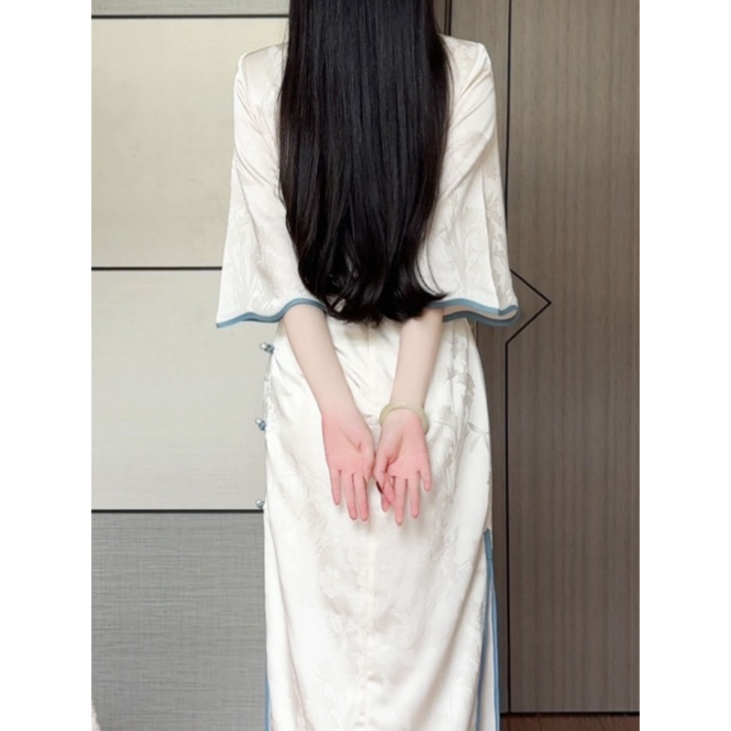 sườn xám trắng viền xanh dương tay lửng thu đông xuân mặc mát mẻ