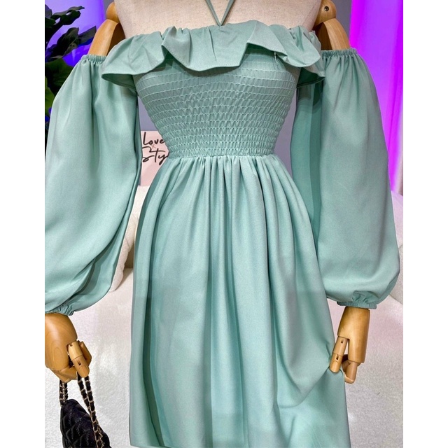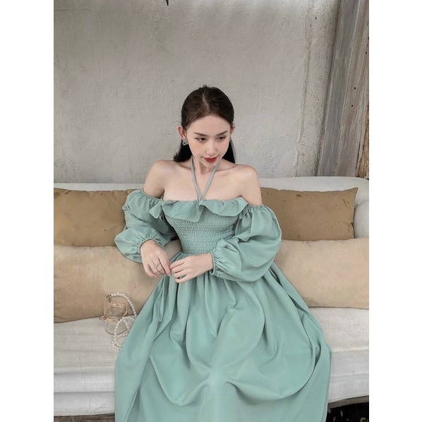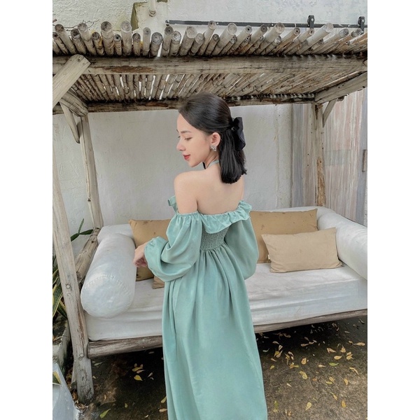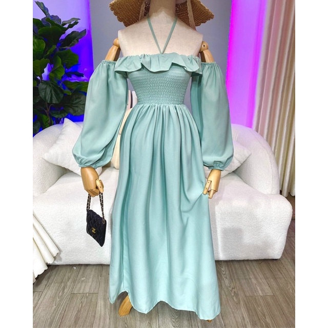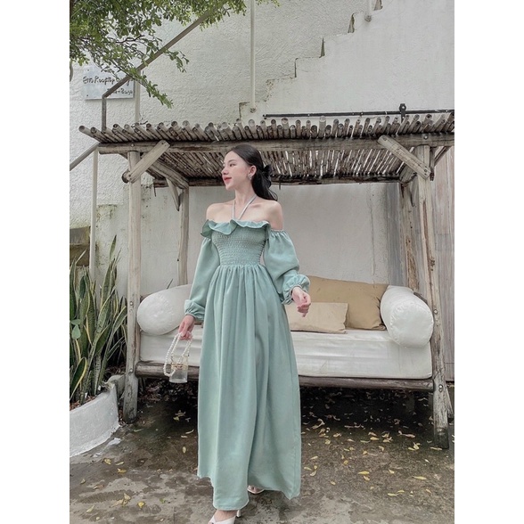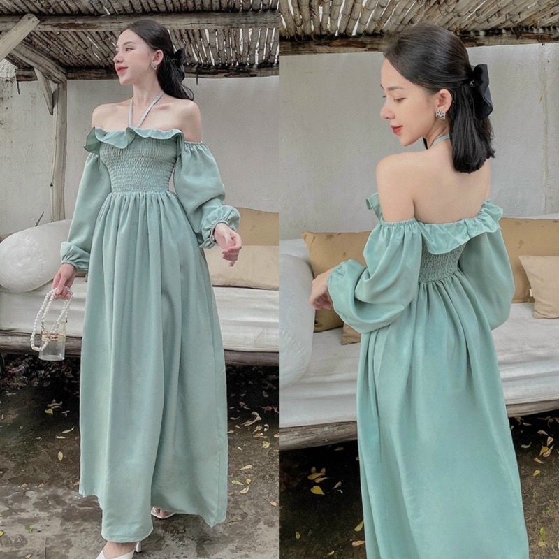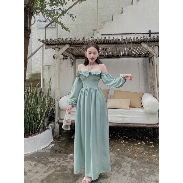 Maxi lụa xanh nhún 2 dây cổ yếm hở/bẹt/trễ/rớt vai tay dài, đầm váy nữ thời trang đi chơi/biển dạo phố du lịch chụp hình
