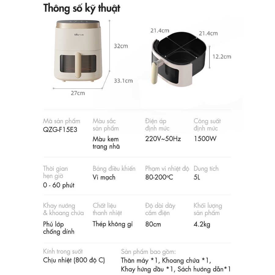Nồi chiên không dầu 5L Bear nồi chiên công suất 1500W, công nghệ nhiệt đối lưu 360 – BH 6-18 tháng