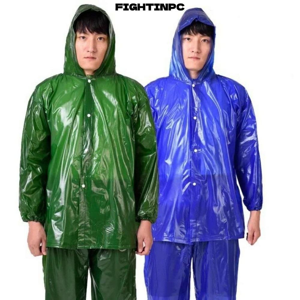 Bộ đồ áo mưa FIGHTINPC làm từ chất liệu PVC chống nước dày, kèm theo mũ trùm đầu, phù hợp để đi xe máy hoặc đi bộ đường dài