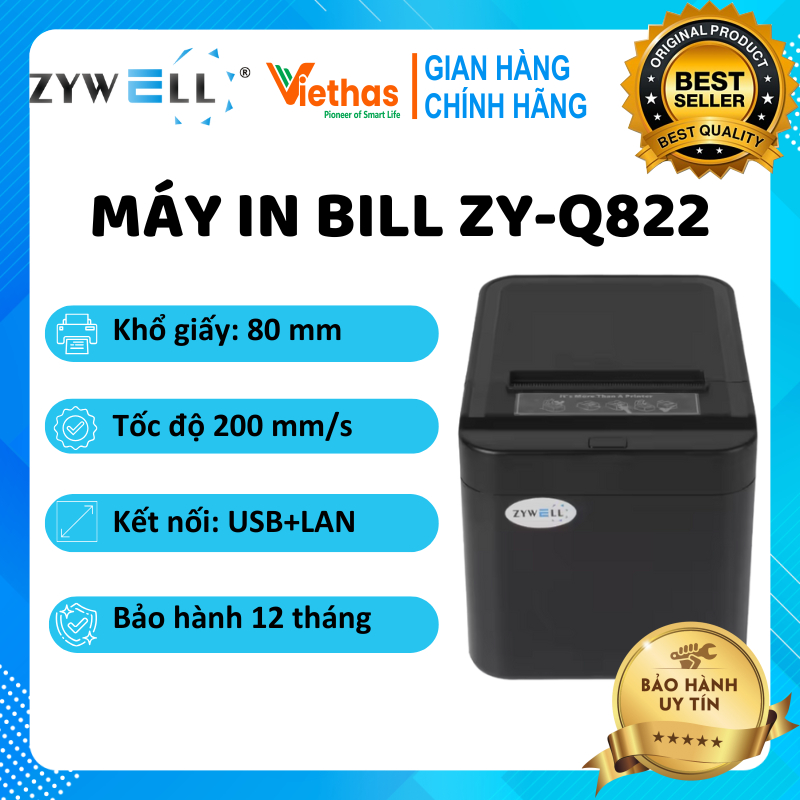 Máy in bill, hóa đơn nhiệt Zywell Q822 cổng USB + LAN khổ K80 in trên máy tính và điện thoại