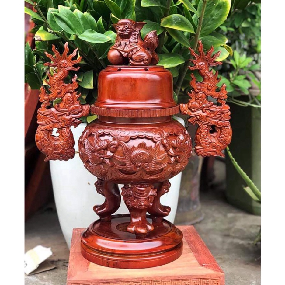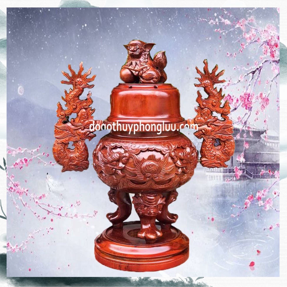 Đỉnh lư hương thờ gia tiên song long gỗ hương