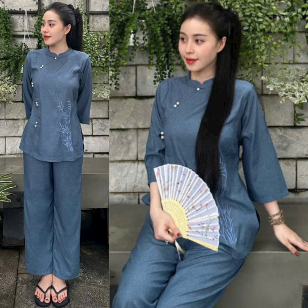 Set bộ nữ linen cao cấp thêu trúc đồ lam đi chùa nữ quần áo phật tử