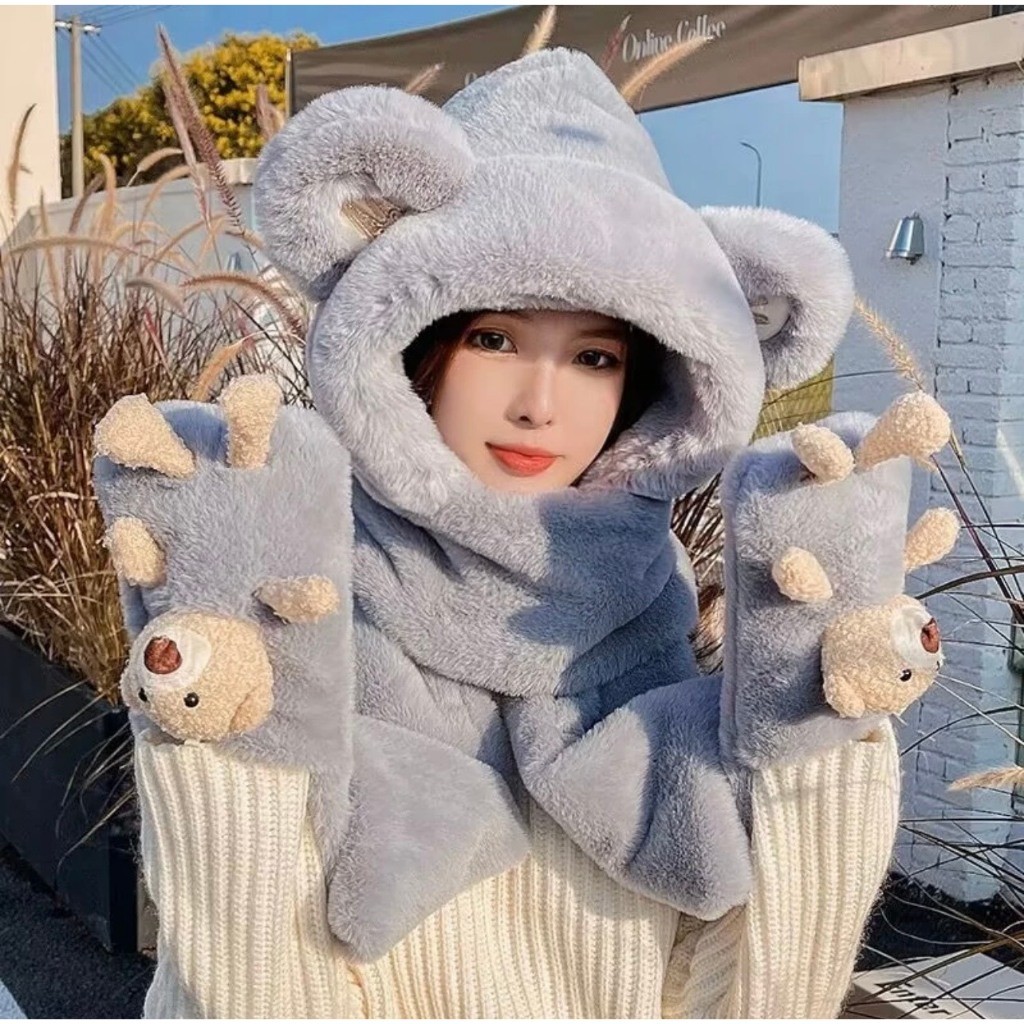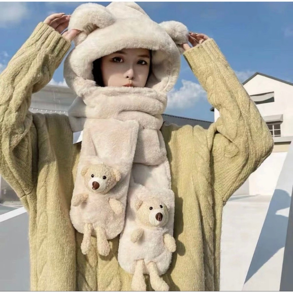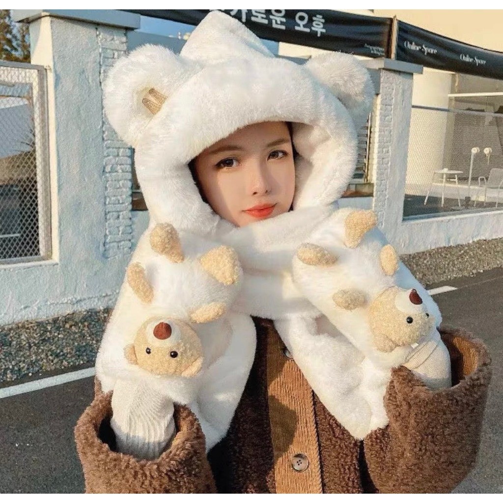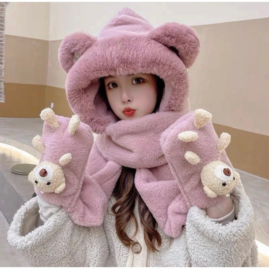 Mũ len kèm khăn quàng cổ bảo vệ tai siêu mềm mịn - Khăn mũ lông trùm đầu kèm gấu đút tay AT268