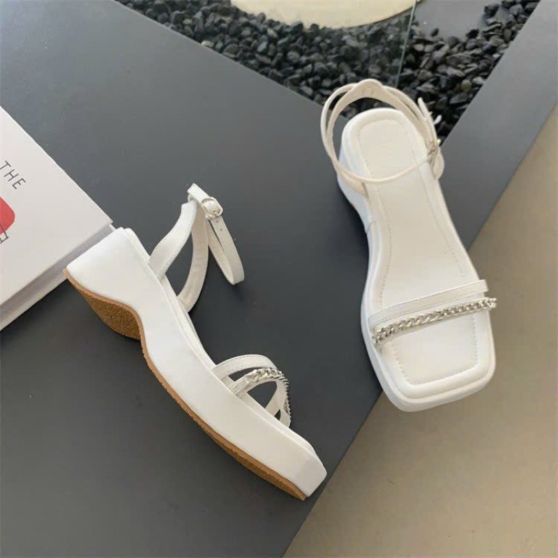 sandal nữ đế bằng cao 5 phân,dép nữ đế xuồng quai mảnh dây xích màu trắng đen THÚY GIÀY VINA STORE-X1
