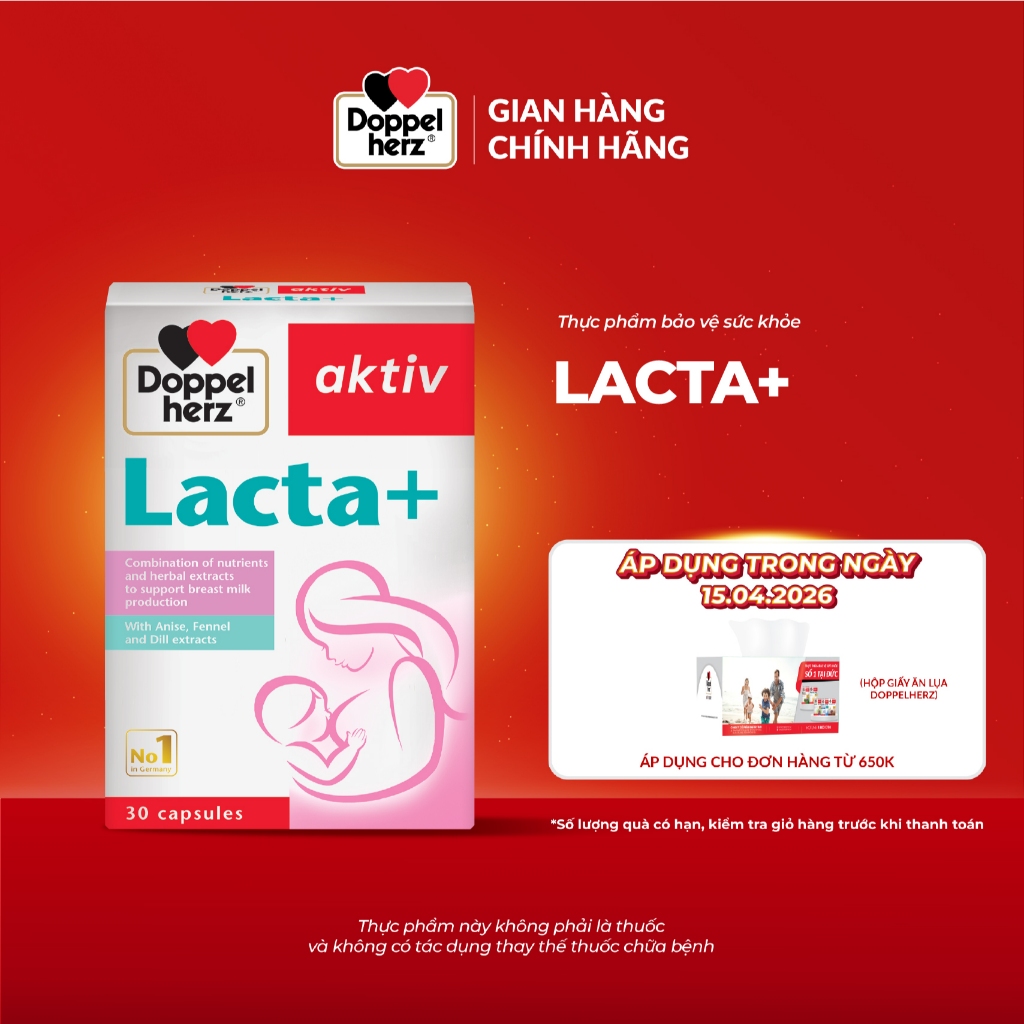 Viên uống lợi sữa Doppelherz Aktiv Lacta+ hỗ trợ cải thiện nguồn sữa mẹ sau sinh (Hộp 30 viên)