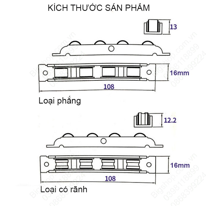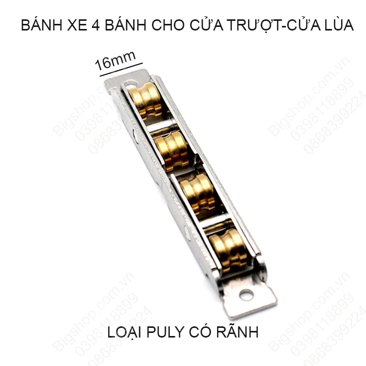 Bánh xe 4 cho cửa trượt-cửa lùa bằng inox không gỉ rộng 16mm, dùng cho cửa lùa gỗ, nhựa, nhôm, thép