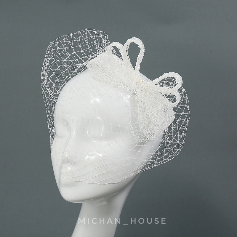 Mũ công nương cổ điển, mũ trùm đầu cô dâu phong cách trung hoa, mũ đội đầu lông vũ có lưới che nửa mặt
