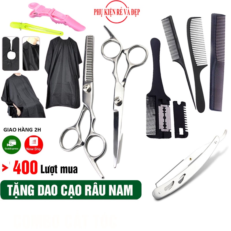 [Freeship] Combo 10 món - Bộ Kéo cắt tóc và tỉa tóc + 3 lược + Áo choàng + Dao cạo + Lược tỉa tóc + 2 Kẹp tóc