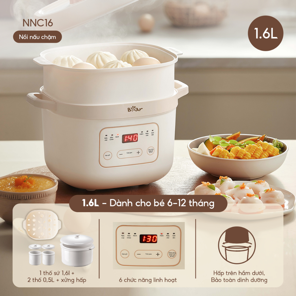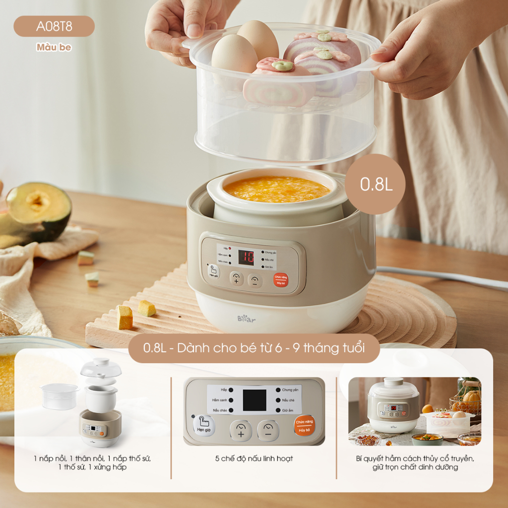Nồi Nấu Chậm BEAR 1L, Nồi Nấu Cháo Chậm Kèm Xửng Hấp Nồi Nấu Cháo Cho Bé Đa Năng Chưng Yến Kho Cá Nấu Chè Hầm SC-4H10E
