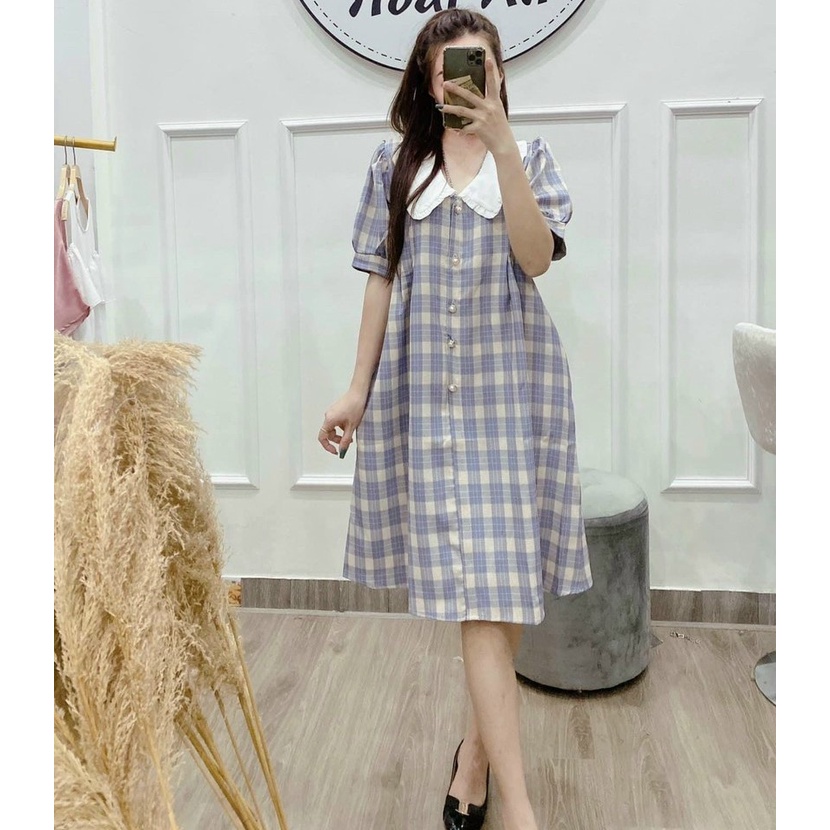 Váy bầu đẹp suông nhỏ xinh xắn sọc kẻ cổ bẻ kết hợp sau sinh