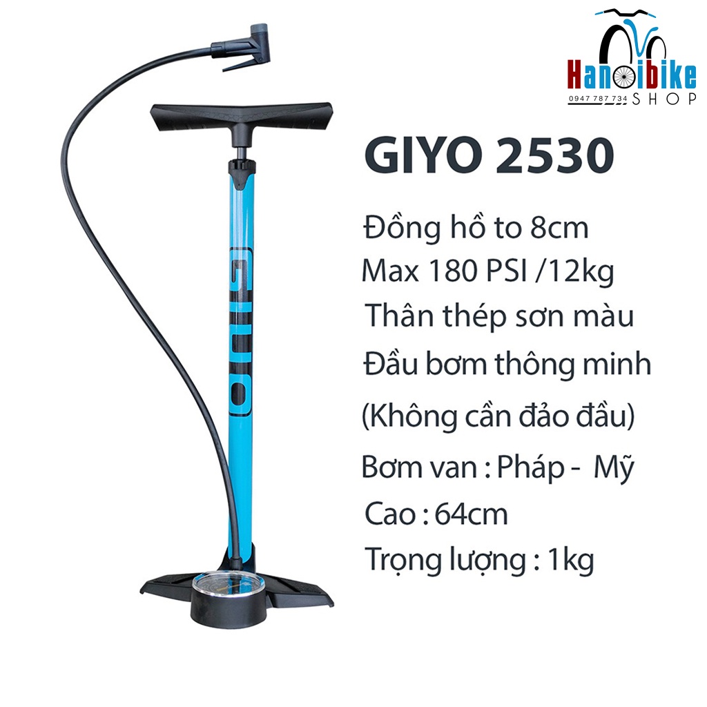 Bơm xe đạp Giyo 2530 mẫu van thông minh áp xuất 180psi sử dụng cho cả van cối, van gạo
