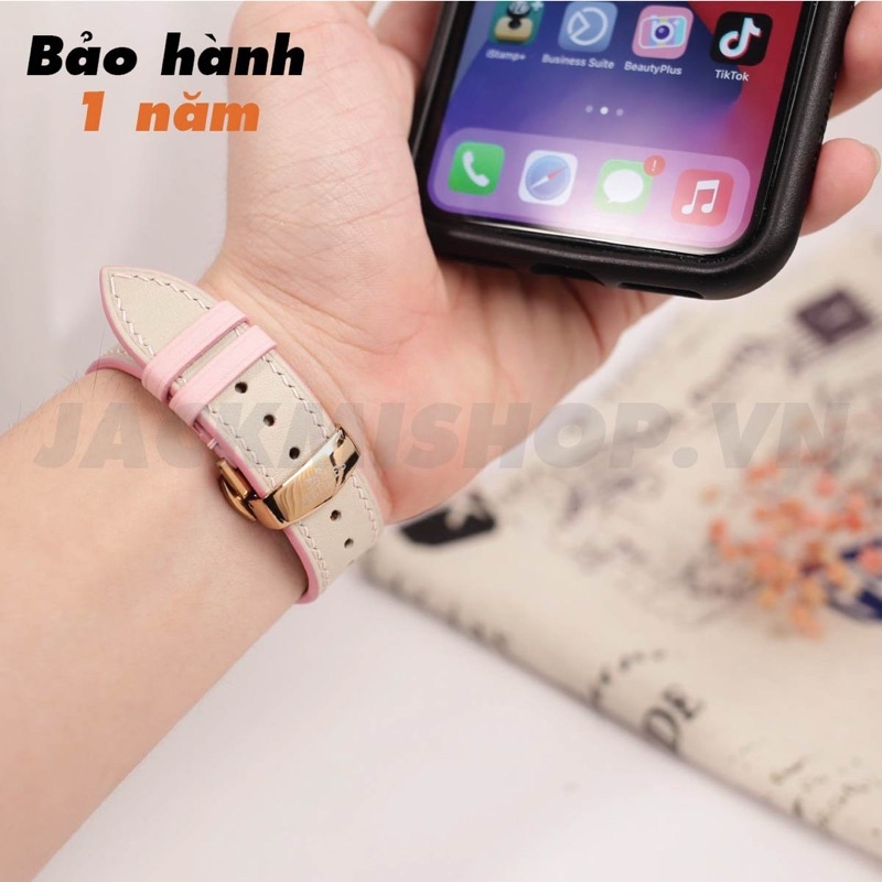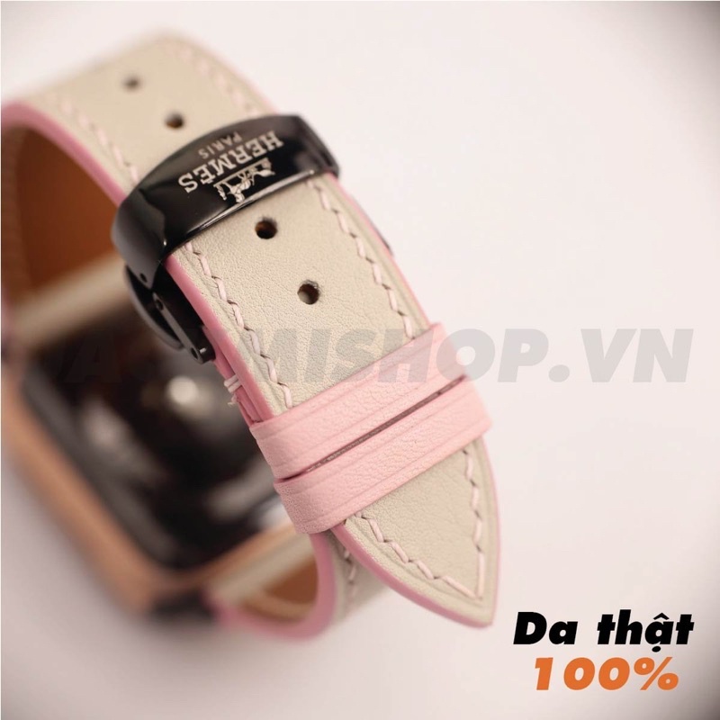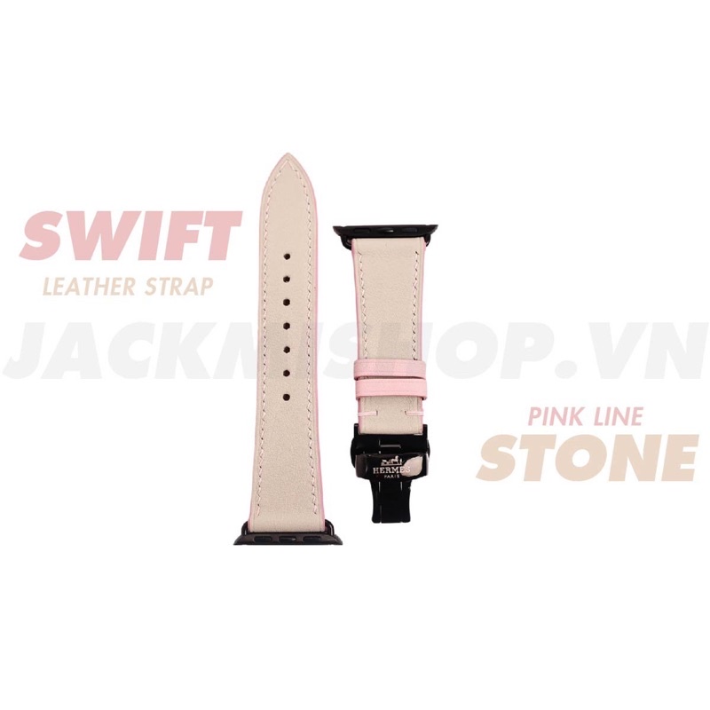 Dây Da BÊ SWIFT màu Kem chỉ Hồng khóa Bướm cho aw series 10 9 8 7 6 SE 5 4 size 49mm 46mm 45mm 44mm 42mm 41mm 40mm 38mm