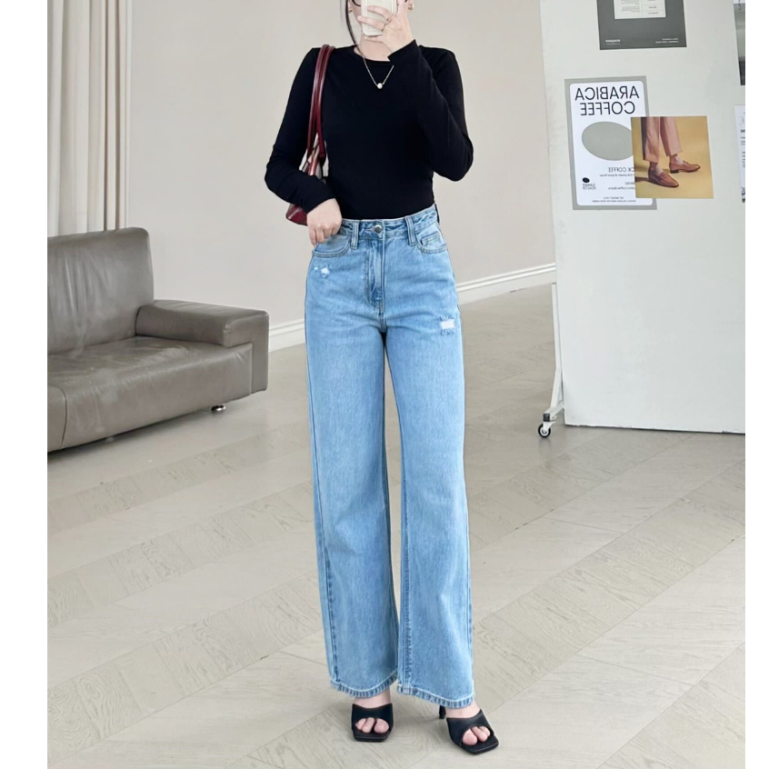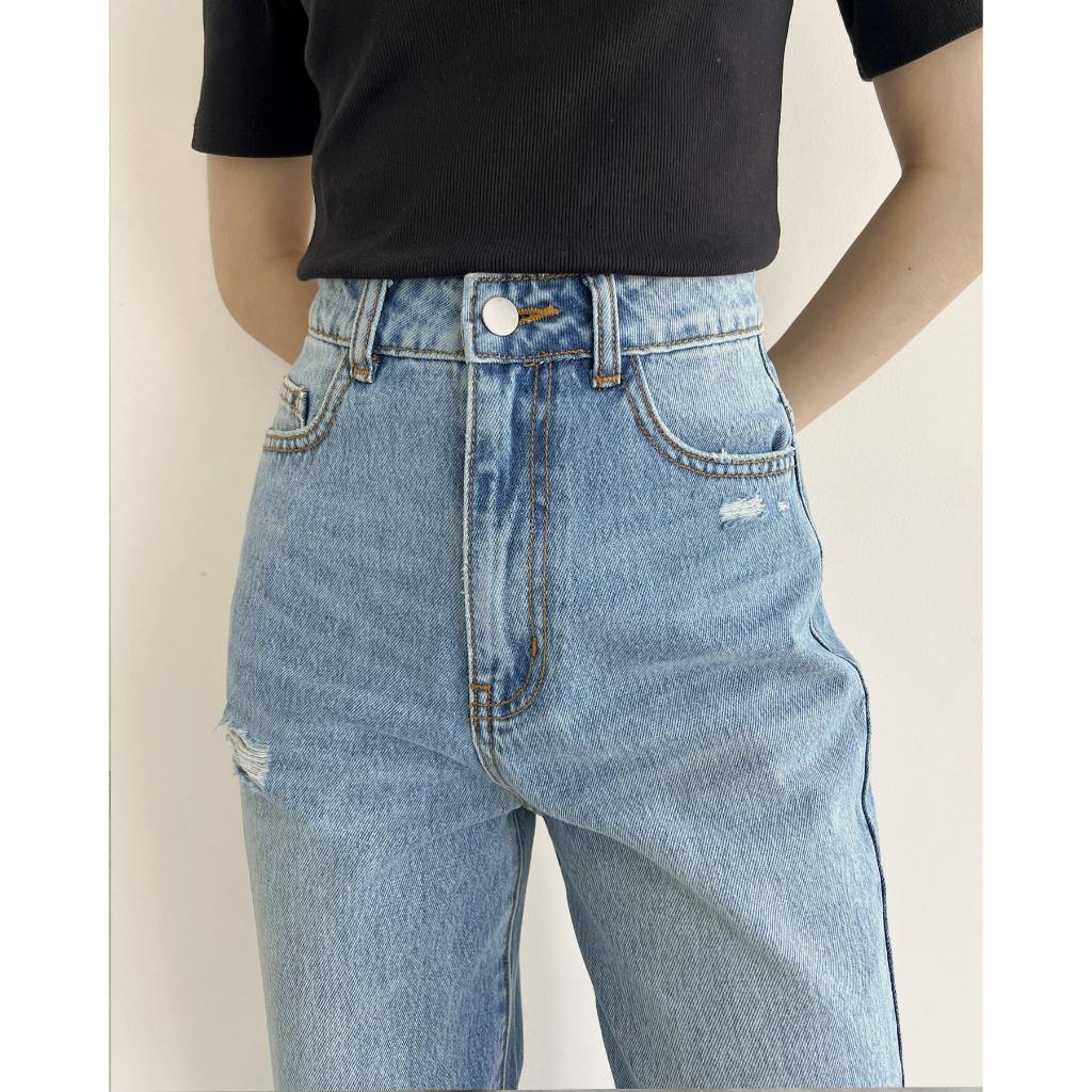 Quần Jeans Nữ REDE LR-02 Ống Suông Rộng Vừa, Lưng Cạp Cao, Màu Xanh Nhạt Rách Xược Hông Ấn Tượng
