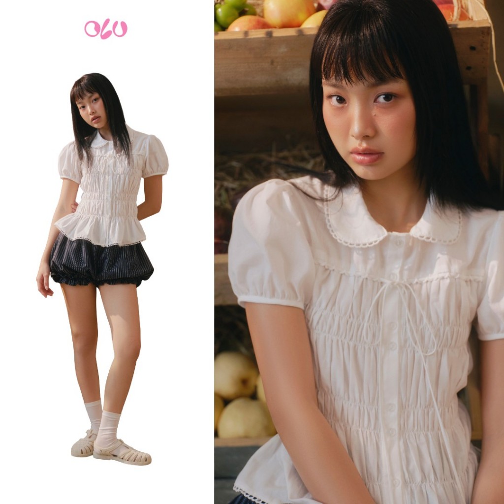 Áo cổ sen tay phồng White Puff Smocked Peplum Shirt dễ thương trẻ trung OLV