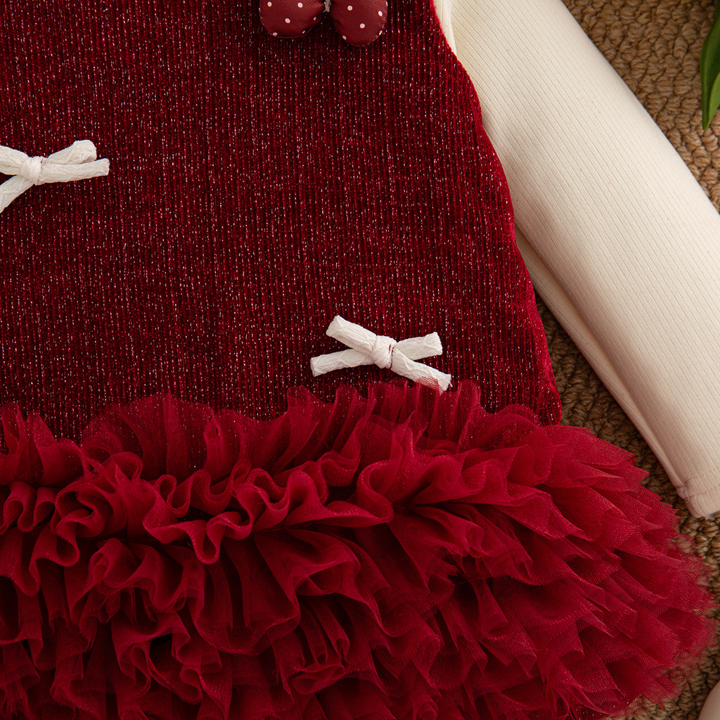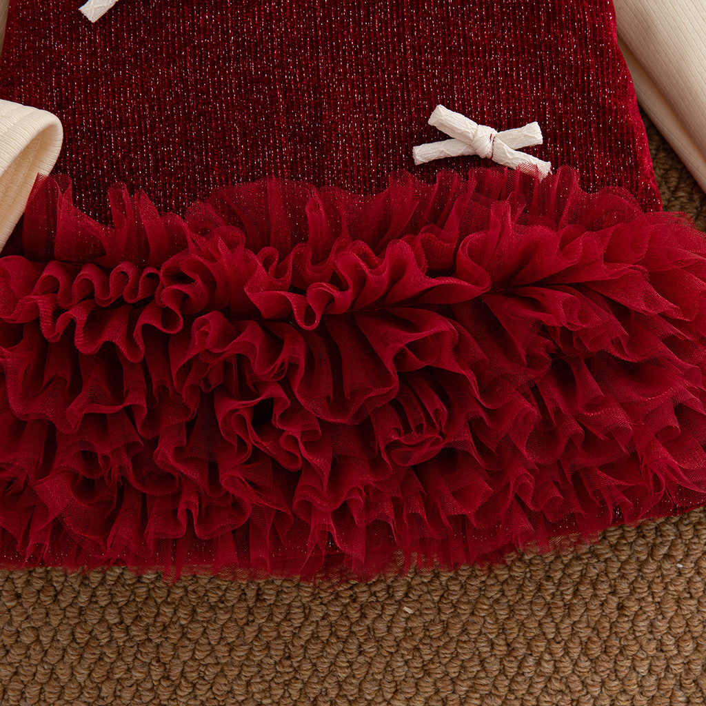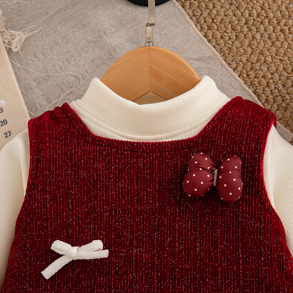 Bộ Váy Đỏ Giáng Sinh Cho Bé Gái Dài Tay Màu Be Với Đầm Nơ Không Tay Quần Áo Thanh Lịch