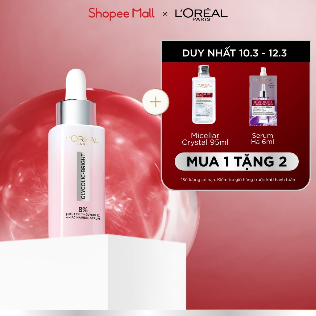Serum Glycolic Melasyl 8% [Melasyl+Glycolic+Niacinamide] dưỡng sáng da, mờ thâm mụn & nám Loreal Paris 30ml