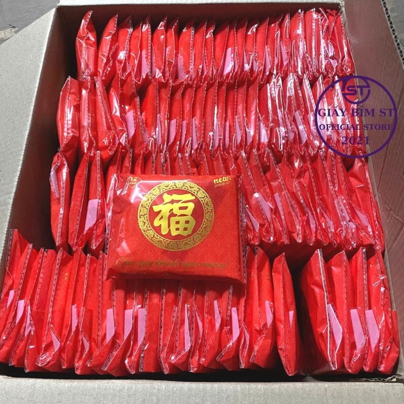 Thùng 100 gói giấy ăn đám cưới, ăn tiệc 12 tờ/gói x 2 lớp đỏ chữ hỉ có kèm tăm