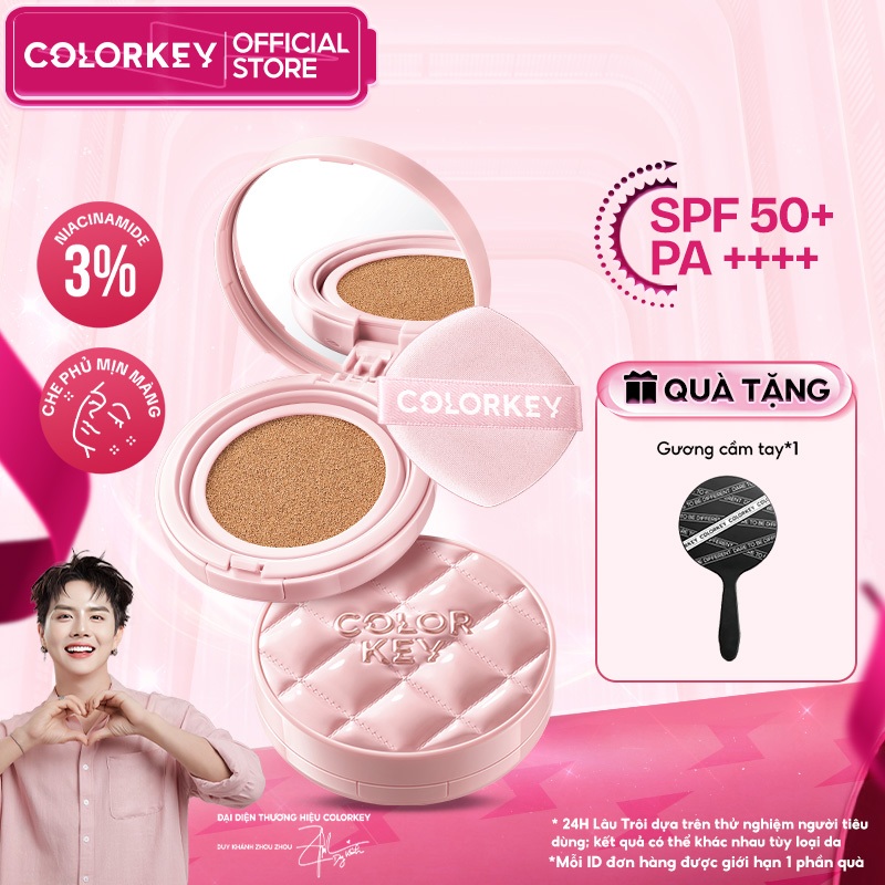 COLORKEY Cushion Chống Nắng SPF50+ PA++++ Kẻ Ô Hồng, Mỏng Nhẹ, Lâu Trôi 24H, Nâng Tone Tự Nhiên, Dưỡng Sáng 3% Niacinamide 11g