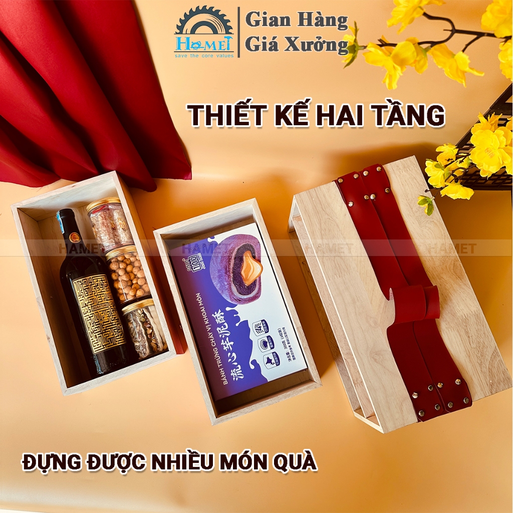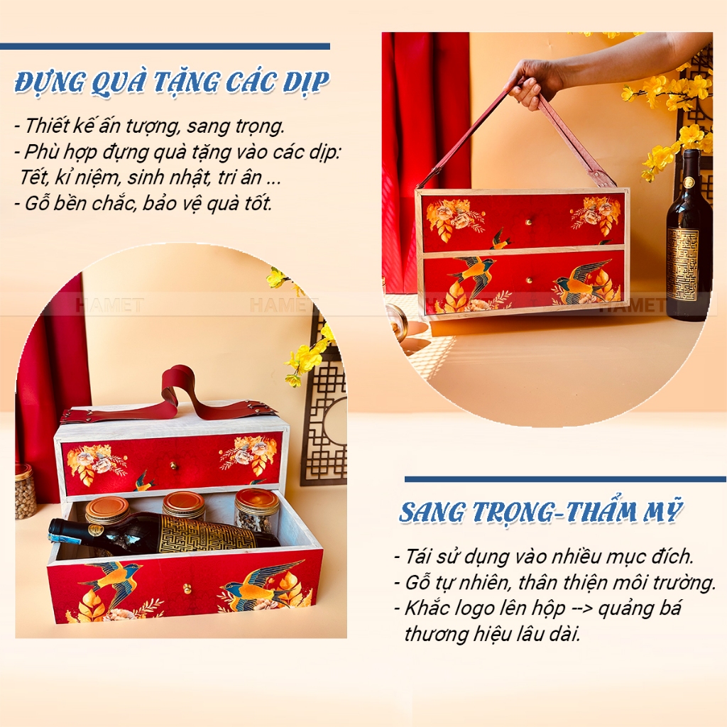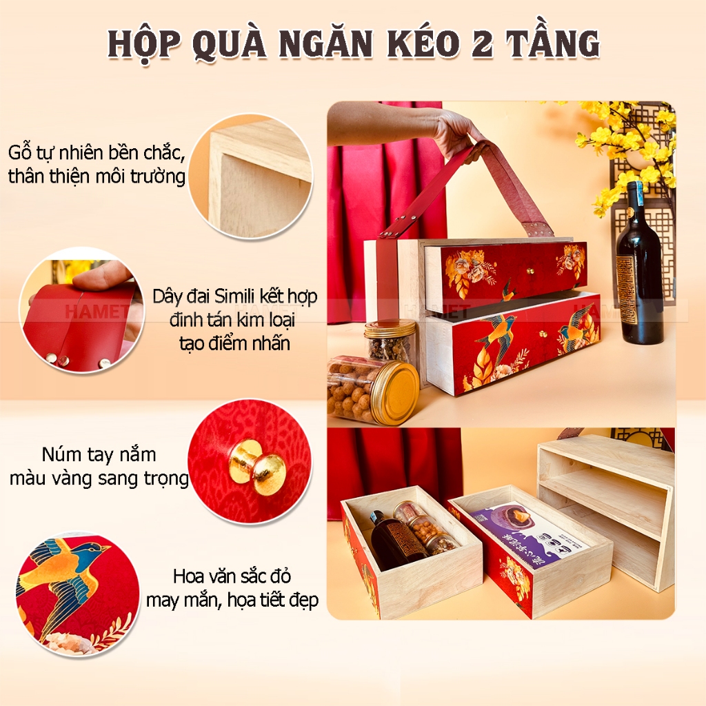 Hộp Quà Tết Gỗ 2 Tầng Ngăn Kéo Cao Cấp HAMET – Hộp Quà Biếu Tết Doanh Nghiệp Có Dây Xách Sang Trọng