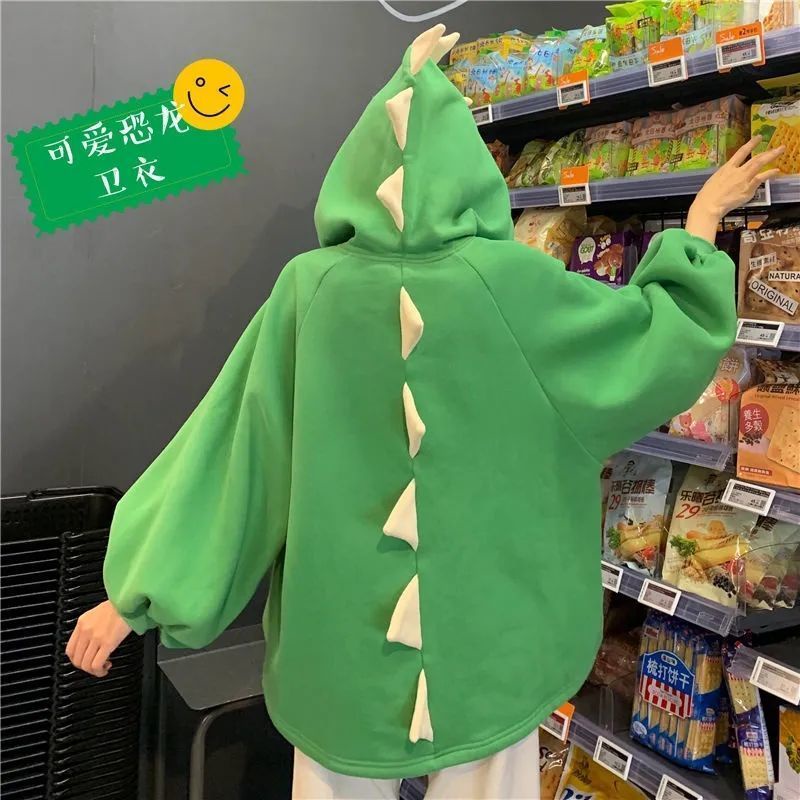 Áo Hoodie Dáng Rộng Màu Trơn In Hình Khủng Long Nhỏ Phong Cách Hàn Quốc Cho Nữ Màu
