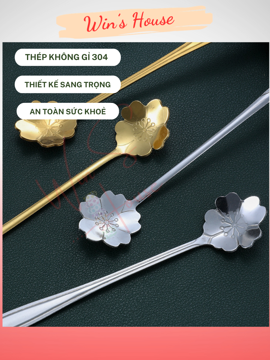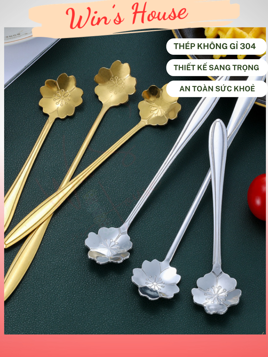 [WinHouse] Thìa cf Inox Hoa đào - muỗng cà phê inox, thìa dài uống trà màu vàng bạc sang trọng nhiều kích thuớc
