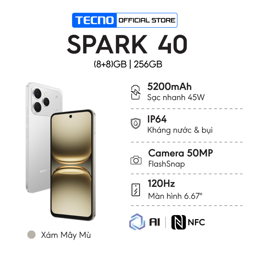 Điện thoại TECNO SPARK 40 (8GB/256GB) - Màn hình 6.67" 120Hz | Pin 5200 mAh + Sạc nhanh 45W | Loa kép | NFC
