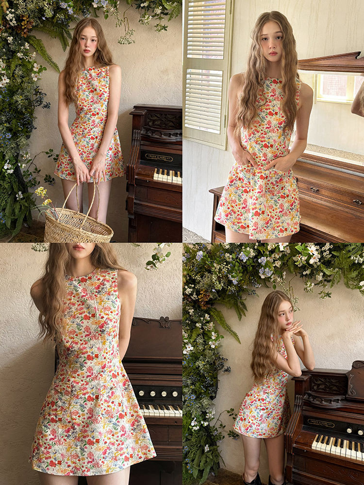 Whbyzwhcb Đầm Áo Vest nữ Mùa Hè Cổ Tròn Không Tay Ôm Vừa Vặn eo Hoa Đỏ Nhỏ